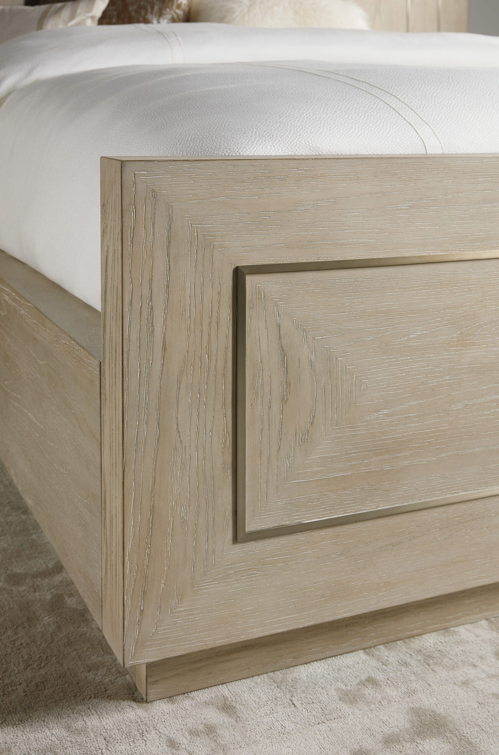 Infuse your master suite with calm and tranquility with the Cascade King Panel Bed, featuring a sophisticated contrast of materials. Crafted of Oak Veneers in a soft taupe finish with dry brushing, this statement bed is accented with champagne-colored metal inlays for an alluring sparkle. Includes the headboard, footboard and rails.