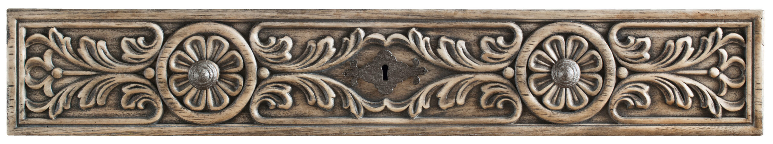 MWD: This accent finish was inspired by native Sandstone with characteristic aged black highlights that has been quarried in the Texas Hill Country for centuries. The custom-crafted hardware in an aged pewter finish has shaped back plates and is inspired by hand-wrought ironworks from Texas Hill Country. Distressing includes rasping, hand planking, chopping and wormholes.