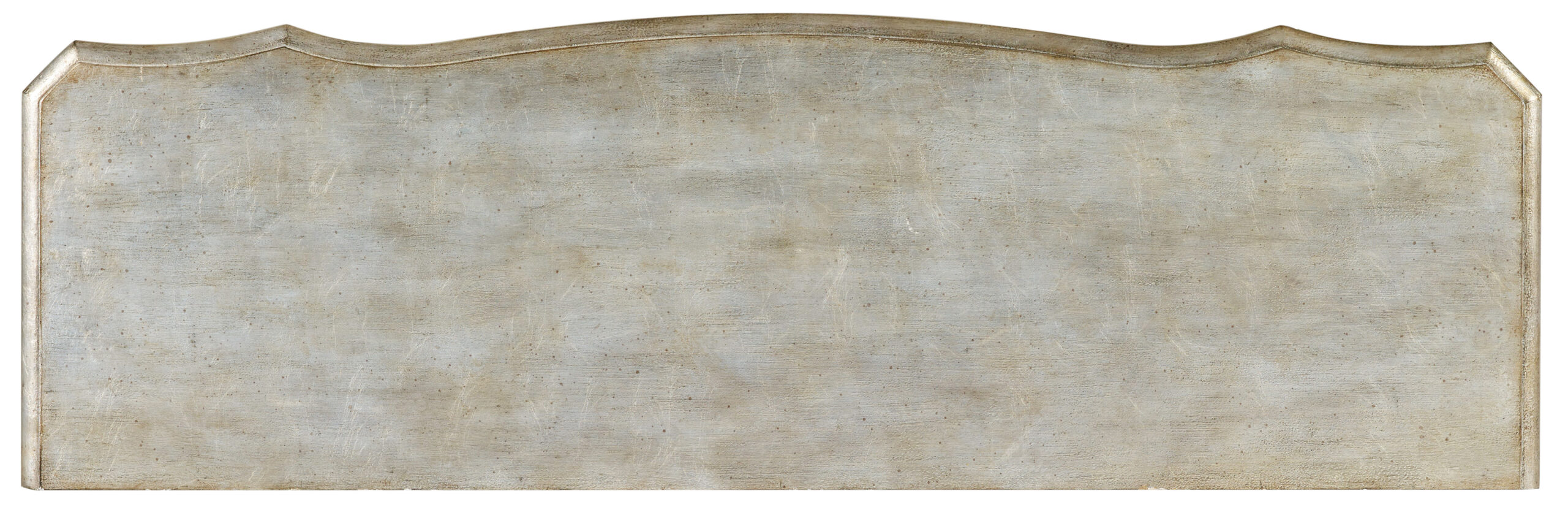 Bardot: Elegant silver leaf with a slightly aged patina with opulent hardware based on an 18th century French antique. Distressing includes rasping.