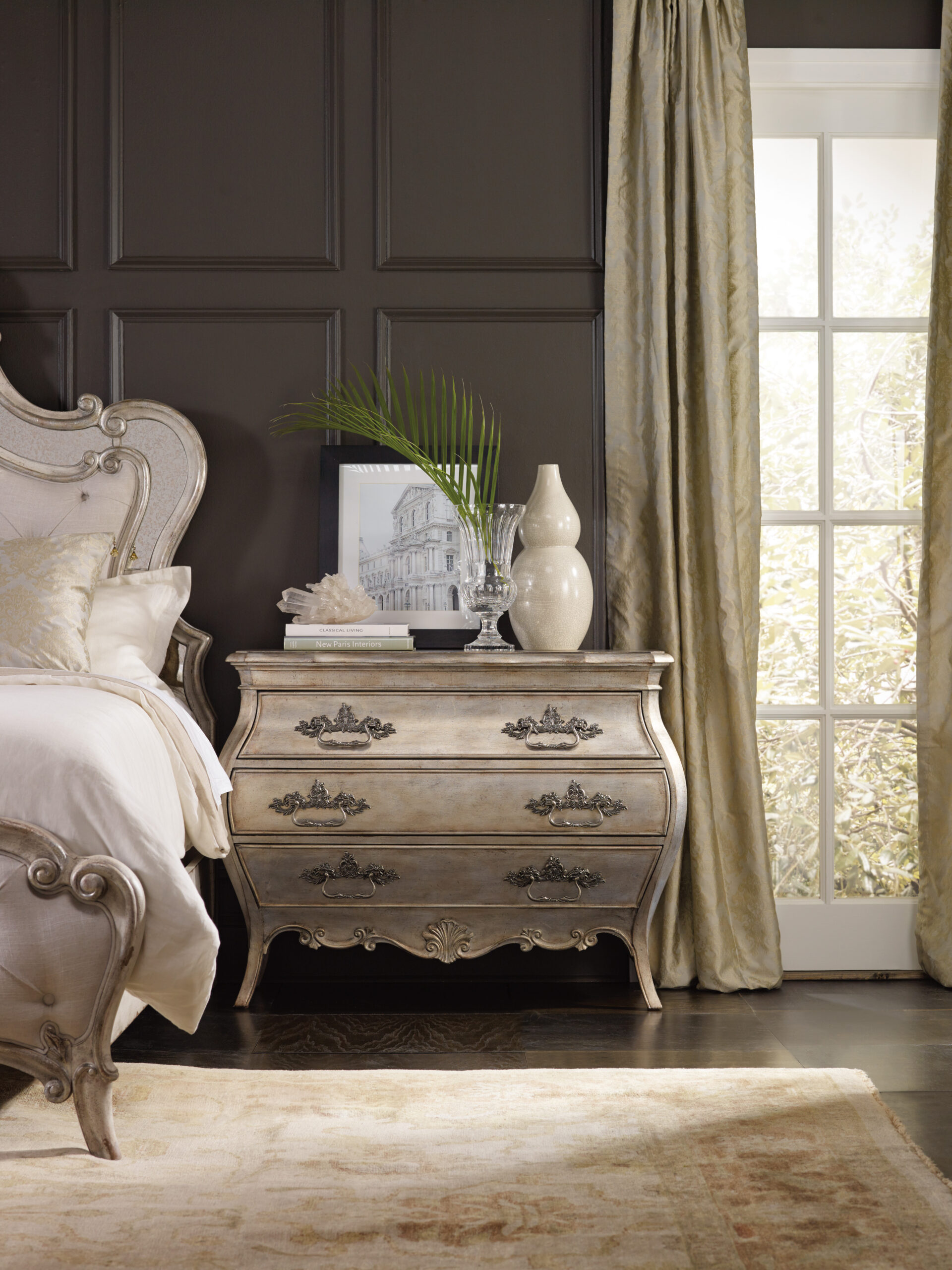 Enchanting and uplifting, this curvy three-drawer bombe-shaped chest is inspired by an 18th Century French Antique and adorned with an elegant silver leaf finish with slightly aged patina and opulent hardware.