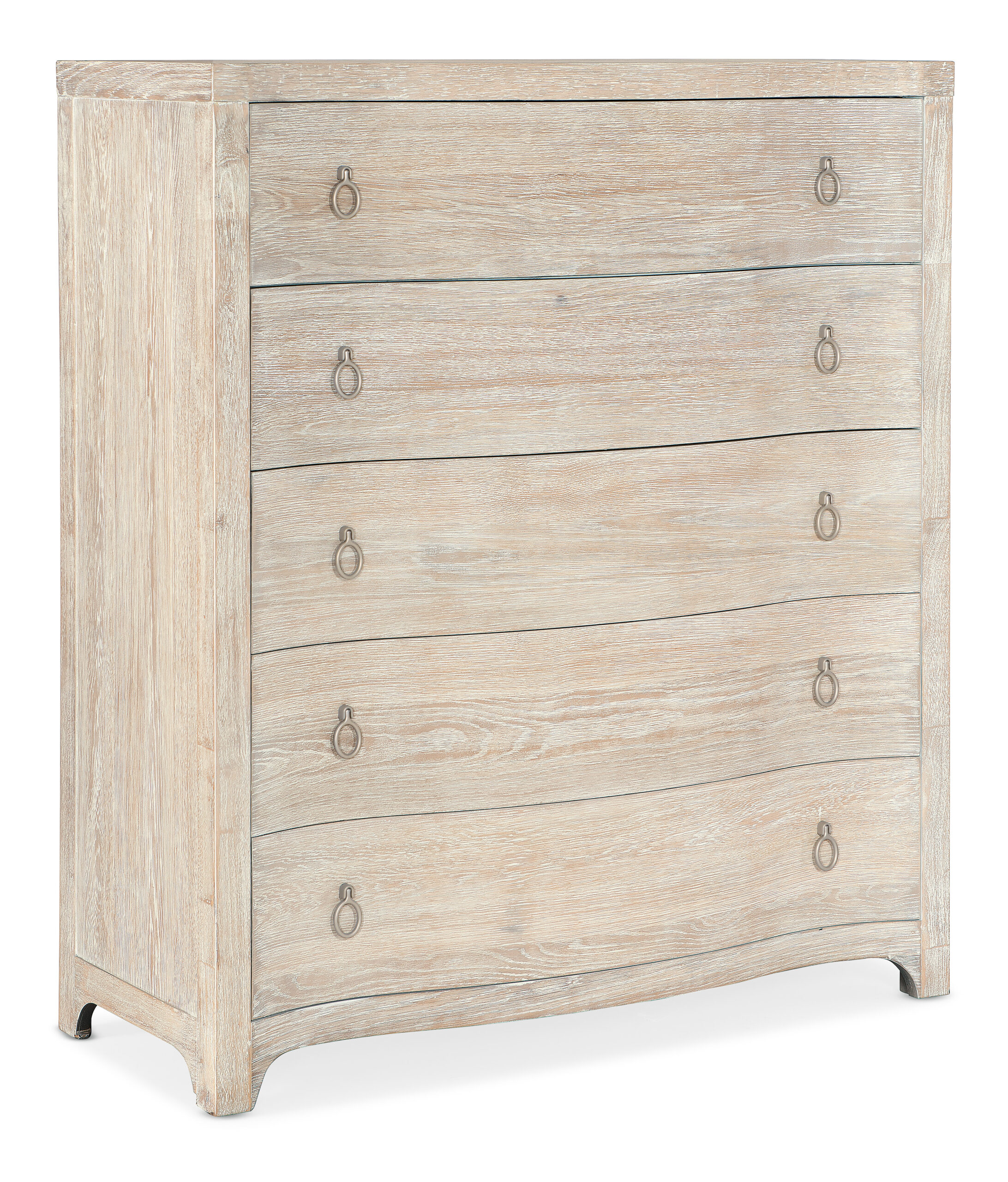 If you aspire to calming palettes and textures, the Serenity Monterey Chest will bring the peacefulness of the outdoors inside with its light and airy whitewashed Surf finish over Oak Veneers. Featuring 5 roomy drawers, the top drawer has a removable black felt liner and the bottom drawer is cedar-lined. Light champagne ring pulls add a touch of sparkle and polish.