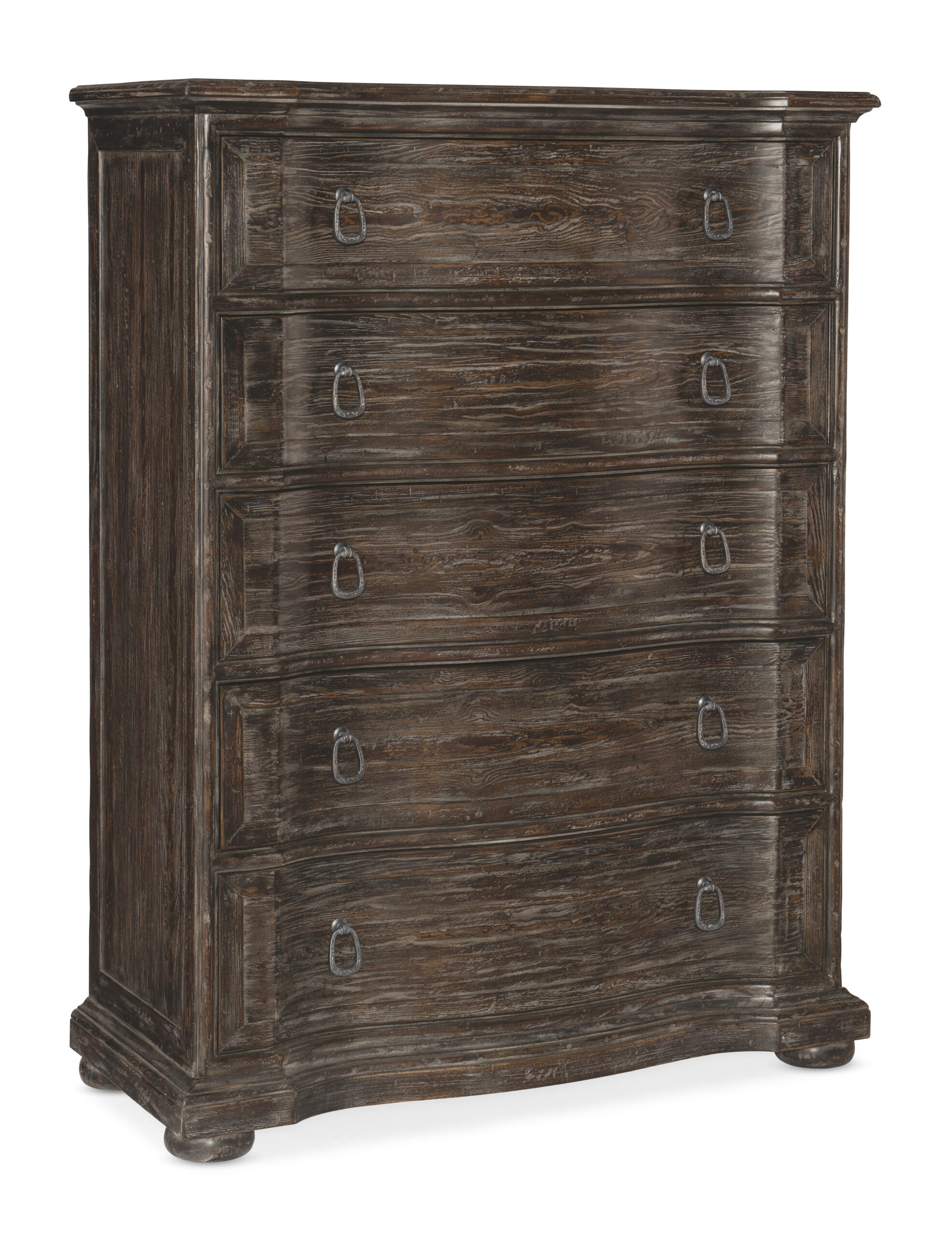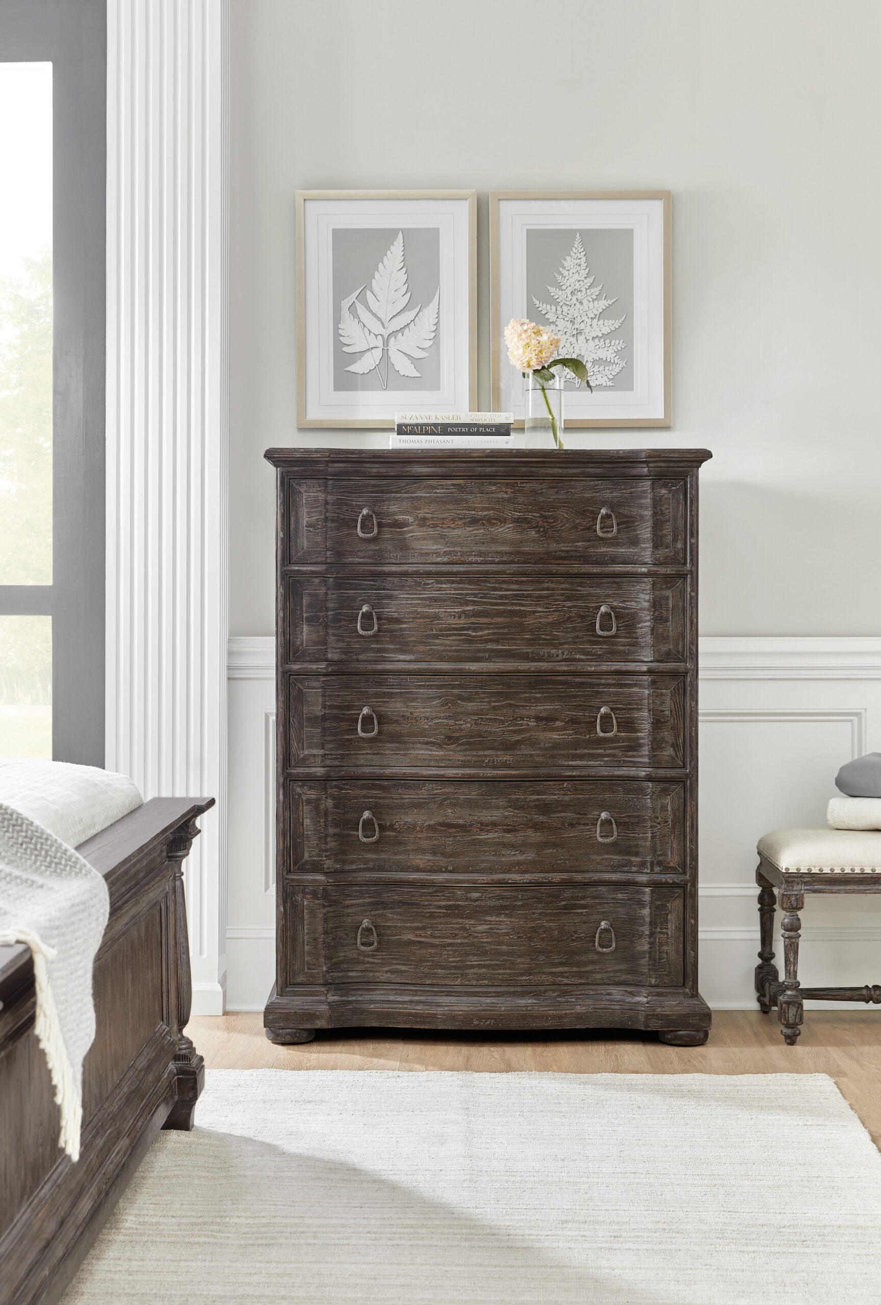 With a chic character, classic silhouette and rich brown Maduro finish with grey undertones, the Traditions Five-Drawer Chest sets an inviting tone for your bedroom retreat. Crafted of Pine Veneers with a Solid-Wood Edge top, the chest is loaded with function, featuring a top drawer with a removable felt liner, a cedar-lined bottom drawer, and all drawers have soft-close drawer guides. Teardrop hardware in an aged pewter finish and chic bun feet add a stylish touch.