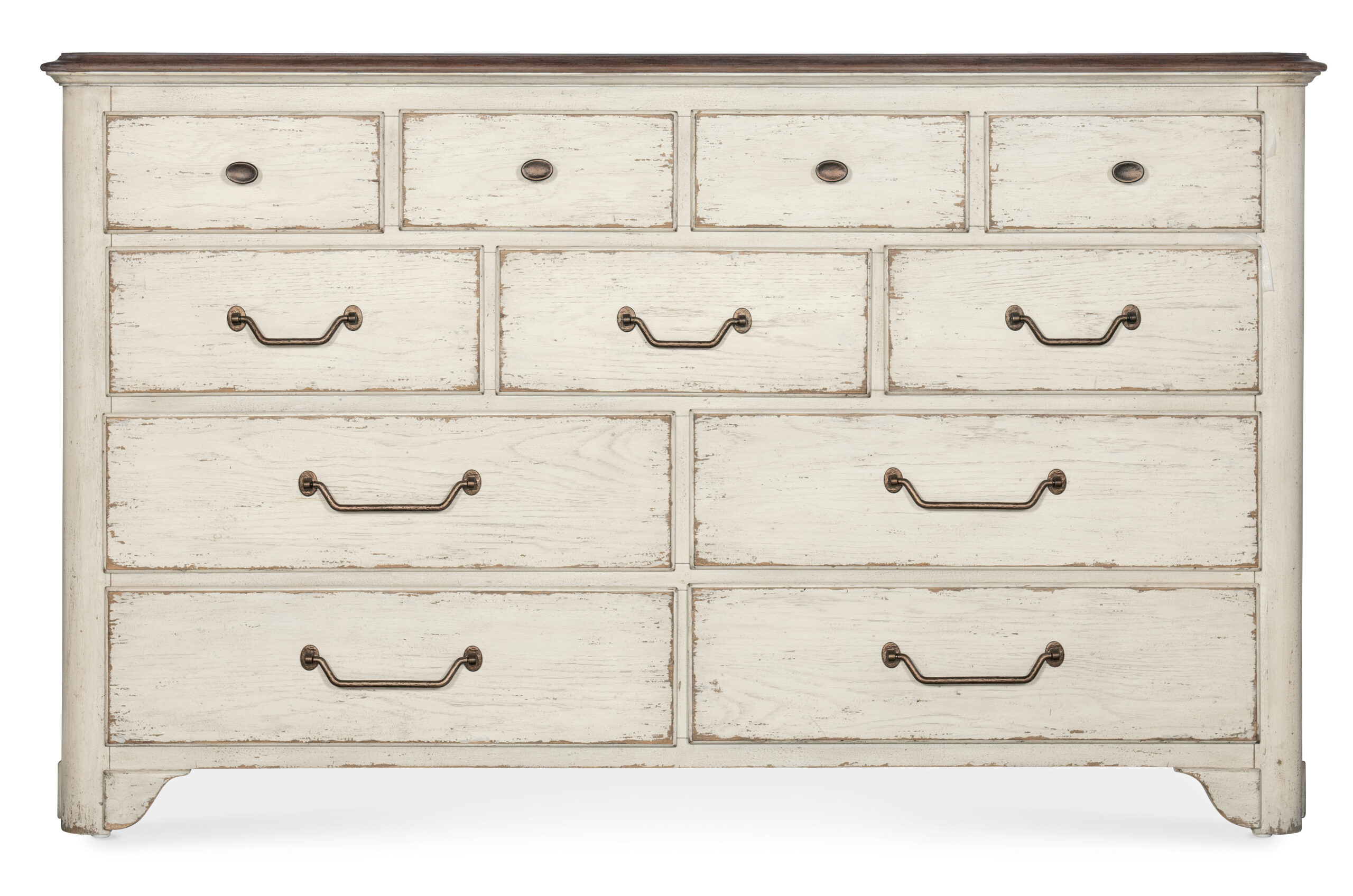 In a two-tone finish with the time-worn Daisy on the base and the warm Honey on the top, the Americana Dresser is a classic, charming design with a nostalgic flair. There are 11 self-closing drawers, and all 4 top drawers have black removable felt liners. The second left drawer has black removable felt-lined jewelry storage, and the bottom two drawers are cedar-lined. All drawers have the Honey finish inside. Crafted of Oak Veneers with Cedar on the bottom drawers with metal alloy pulls in an antique bronze finish.