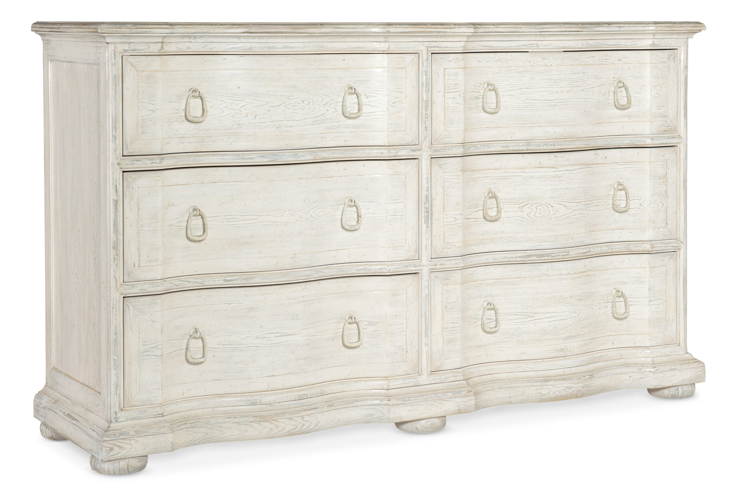 Suggestive of furniture found in rural England in the 17th Century, the Traditions Six-Drawer Dresser has serpentine-shaped drawer fronts and aged pewter-finished ring pull hardware. Crafted of Pine Veneers, the dresser is finished in Magnolia, a soft white with distressing for a casual appeal. The top left drawer has a removable felt liner, and the top right drawer has a removable felt jewelry tray. Both bottom drawers are cedar-lined, and all drawers have soft-close drawer guides.