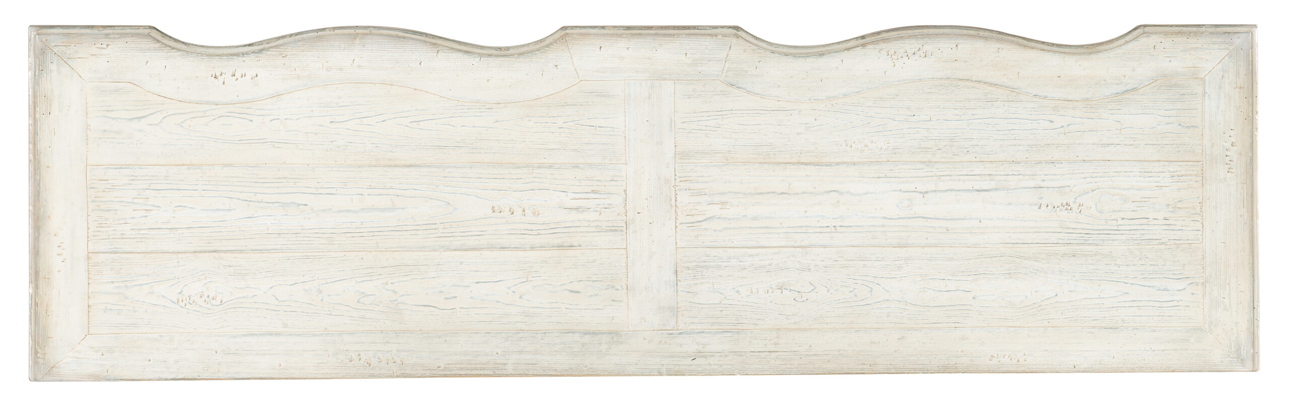 Magnolia: a soft white finish. Distressing includes rasping, wormholes and sandblasting. Hardware is a creamy white ring pull with rub-through.