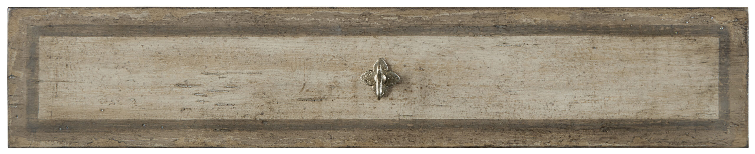 Sorrento, a soft taupe blended with a gray two-tone paint, finish is a mix of Weathered Shale and Light Tusk. Distressing includes hand planing, wormholes, rock, rasping edge and scraping. Decorative key and dogwood flower backplate with fleur de lis pendant hardware in hand hammered florentine gold color.