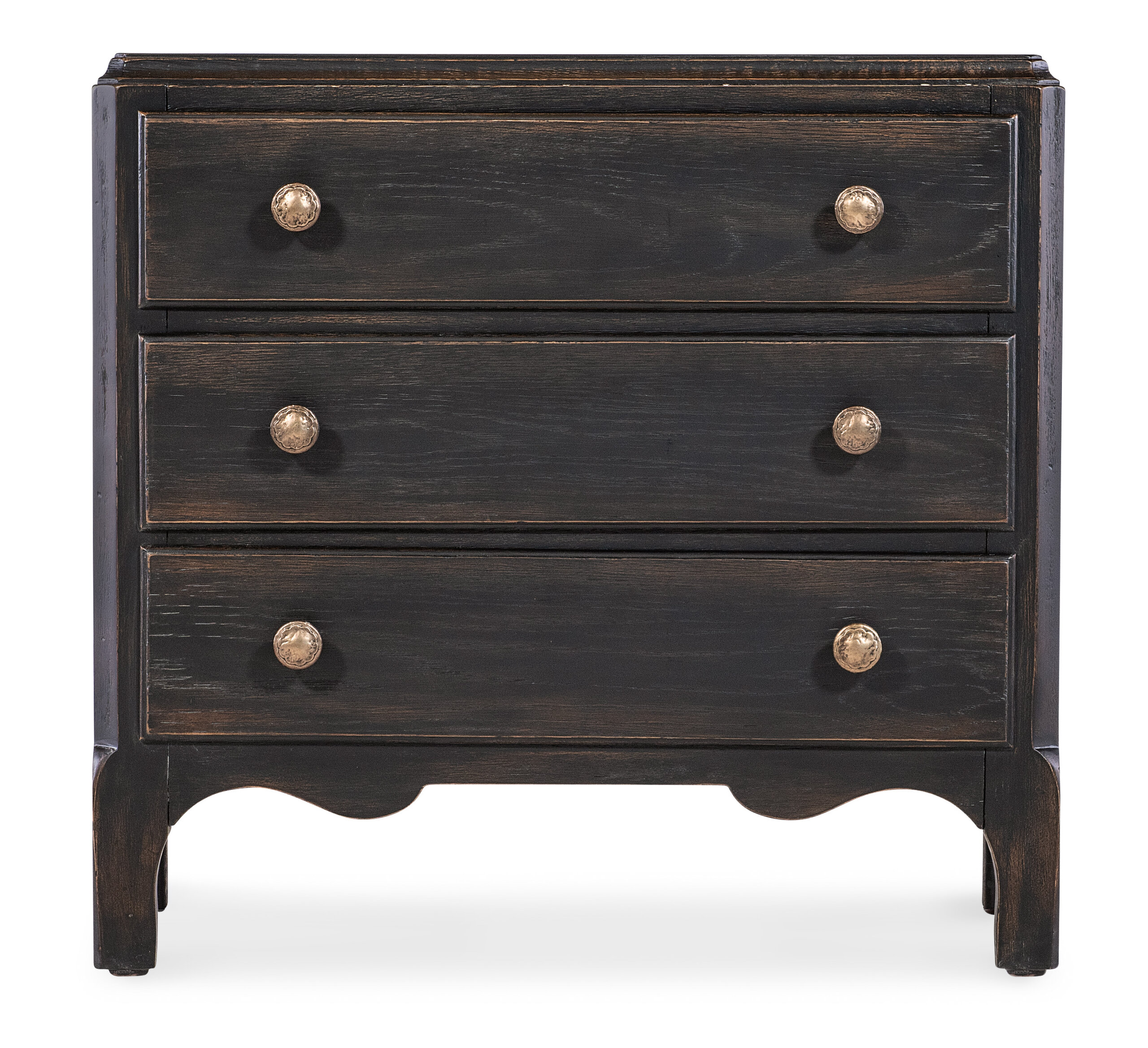 In a classic, charming design with a nostalgic flair, the Americana Three-Drawer Nightstand is crafted of Oak Veneers with a Solid-Wood Edge Top, a scalloped-shape base and finished in the deep, dark Molasses tone. There are 3 self-closing drawers, with the interiors finished in the warm Honey color. Metal alloy knob pulls in an antique bronze finish.