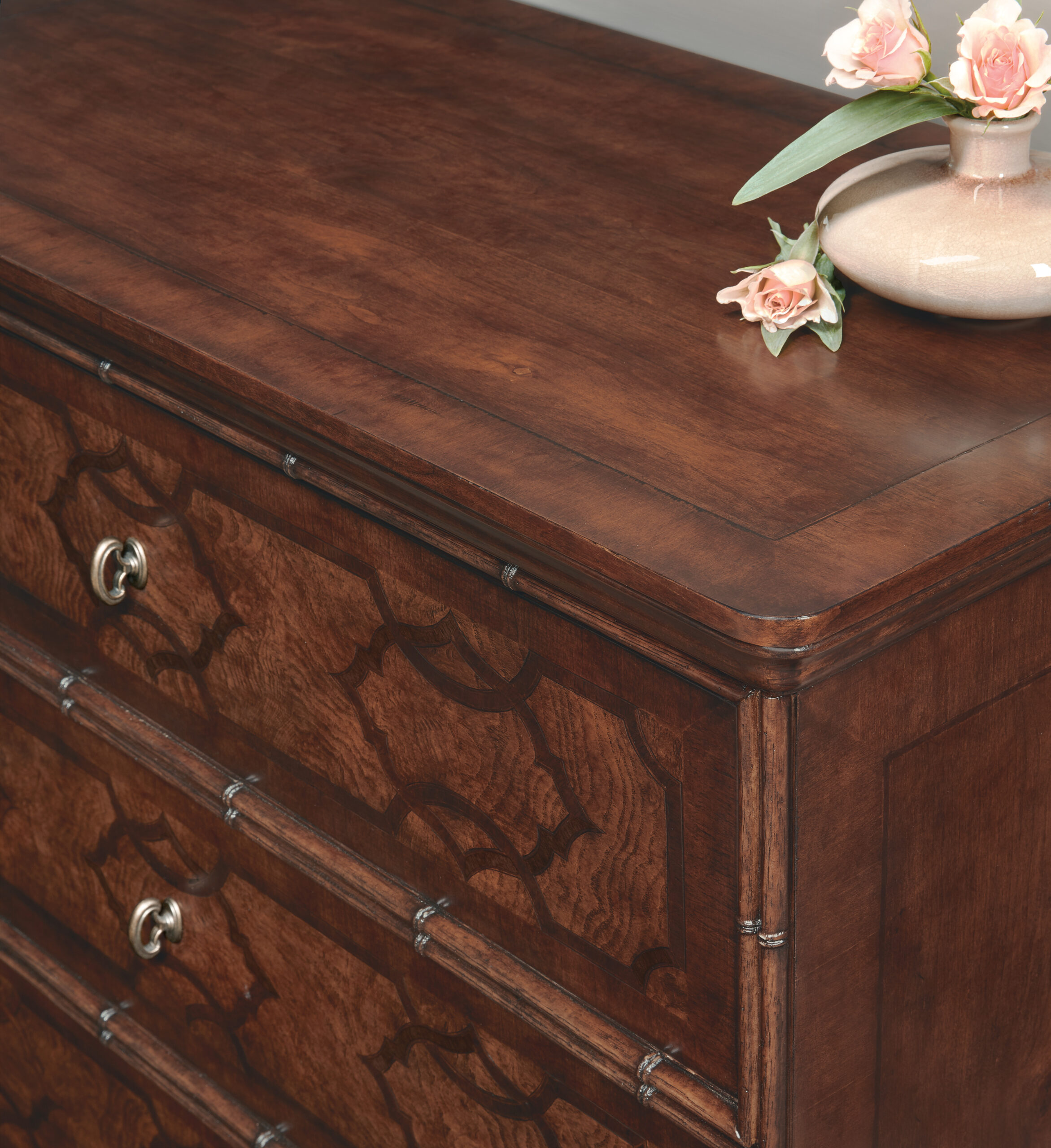 Celebrate the traditional soul and sophisticated beauty of Federal and Georgian design with this majestic Charleston Three-Drawer Nightstand adorned by inlay accents on the drawer fronts and updated for today with bun feet and tech-friendly features. Each of the 3 self-closing drawers has a cherry color interior. Crafted of Cherry, Walnut Veneers, Walnut Inlay and Olive Ash Burl, it features a vibrant Maraschino Cherry finish. There is a two-port USB Outlet on the back and a cord clip on the back.