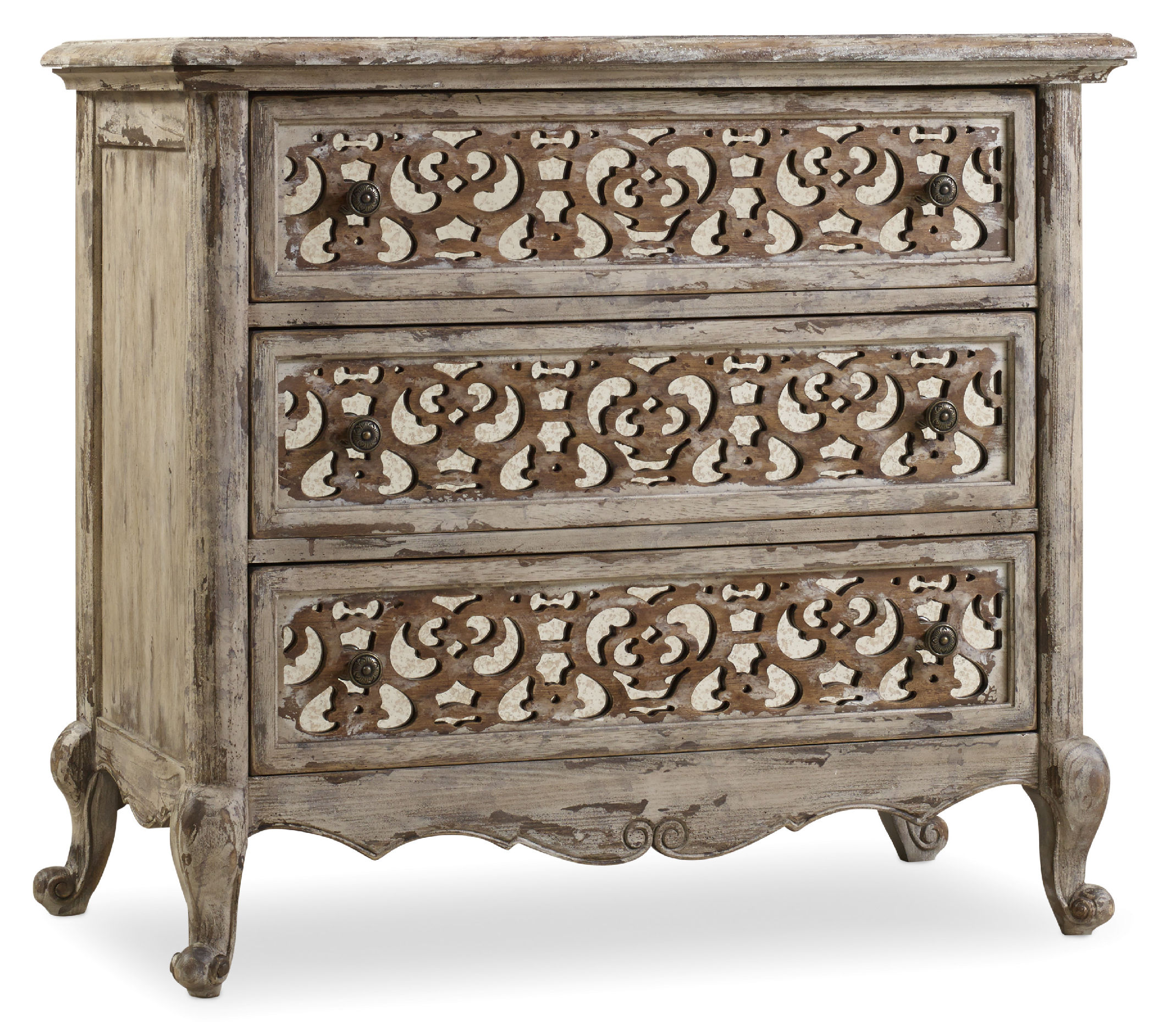 Create a bedroom retreat of unsurpassed romance with the Chatelet Fretwork Nightstand with its exquisite Caramel Froth and Parish Vintage finishes with intricate fretwork over antique mirror and generously scaled, burnished bronze drawer pulls inspired by antiques. All three drawers are wallpaper lined. Convenient electrical outlet included.