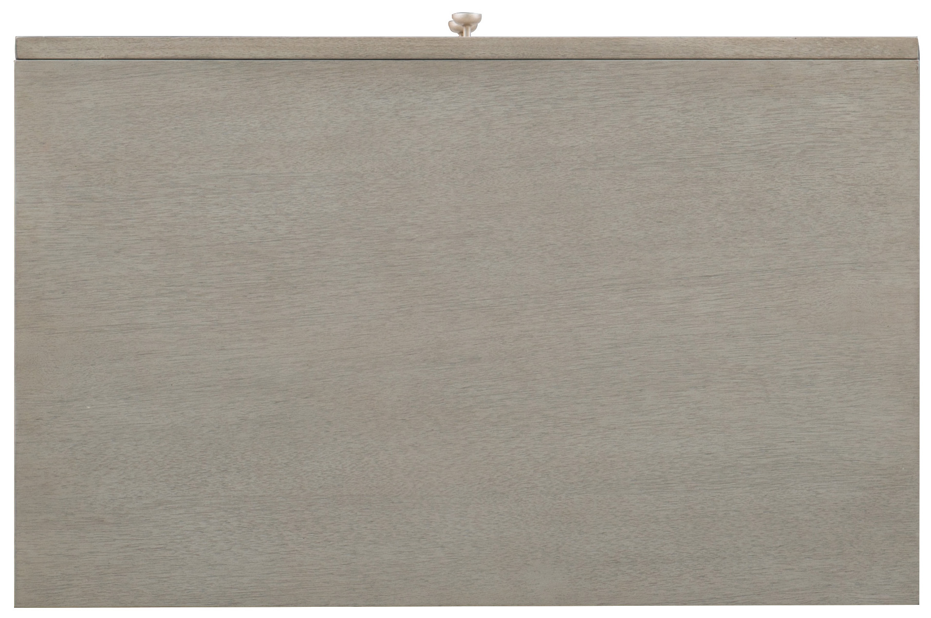 A serene gray beige finish applied to lightly sand-blasted walnut veneer for an organic and textured look. Champagne silver finish on the metal elements and hardware. Custom-designed knob hardware in a champagne silver finish. Distressing includes wire brushing on wood surfaces and texturing on metal.