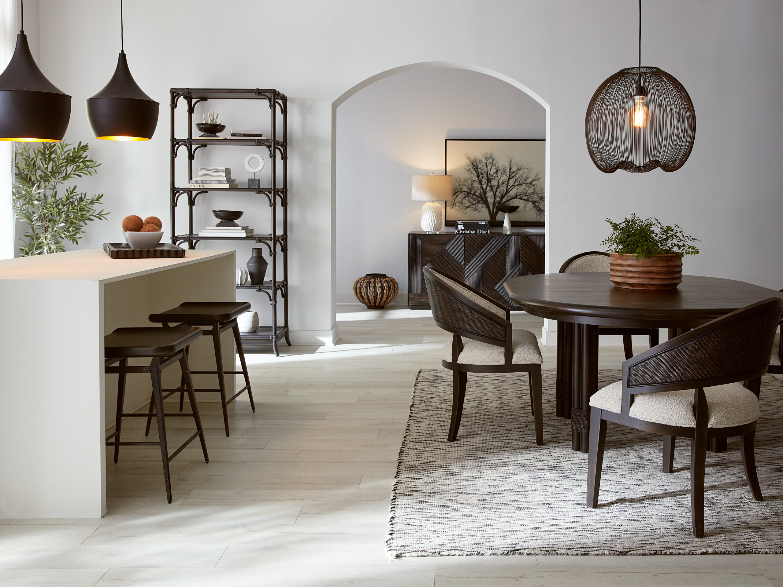 Retreat is crafted with flat cut cathedral oak veneers and is characterized by two distinct finishes. Each finish is transparent by design to showcase the unique grain patterns of the veneer. Dune is light as sand and smooth as a shore after a receding tide. The second finish, Black Sand was inspired by the black silk sands found on the shorelines of exotic beaches of Maui and Tahiti. Inspired by serene, tropical resort destinations that offer an escape from the pressures of modern life, Retreat is designed to help consumers replicate these peaceful and tranquil environments within their home. The collection can be curated in two distinct personalities: Island Oasis and Modern Zen. Island Oasis intermingles both finishes, creating a tropical retreat-inspired vibe accentuated with organic details such as rope, cane, travertine and woven accents. Highlights include a dramatic pole-cane inspired poster bed, island influenced dining pieces and several upholstered accent pieces using printed and woven textiles and soft sage-toned leather. A few pops of accent finishes called Seagrass and Lagoon can be found on select pieces, enhancing the tropical mood of the collection. Modern Zen delivers a tranquil personality with a contemporary twist that showcases the Dune finish, which is enhanced with accent items in Black Sand. Several pieces incorporate woven cane, dramatic split bamboo-inspired accents as well as Travertine stone. Highlights include a woven cane panel bed with clean modern lines and a variety of case pieces featuring geometric patterns and spa-inspired accents. Upholstered stationary and accent seating – available in sage and caramel tone leathers – complete the Zen narrative. Adding the finishing touch, the collection’s hardware is custom designed to match each personality. Look for reed-inspired designs in Island Oasis and gently textured designs in Modern Zen. Both hardware options are featured in a soft pewter plated finish.