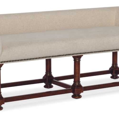 Celebrating the natural beauty of a simpler time, the inviting Americana Dining Bench has a nostalgic design including a spindle-style back with carved accents on the spindles and frame. The fabric seat is upholstered in the linen Biscuit performance fabric with welt trim. Crafted of Oak Veneers, the bench is finished in the time worn white Daisy finish, with the look of pieces passed down through the family over time and revealing the rich oak character beneath.
