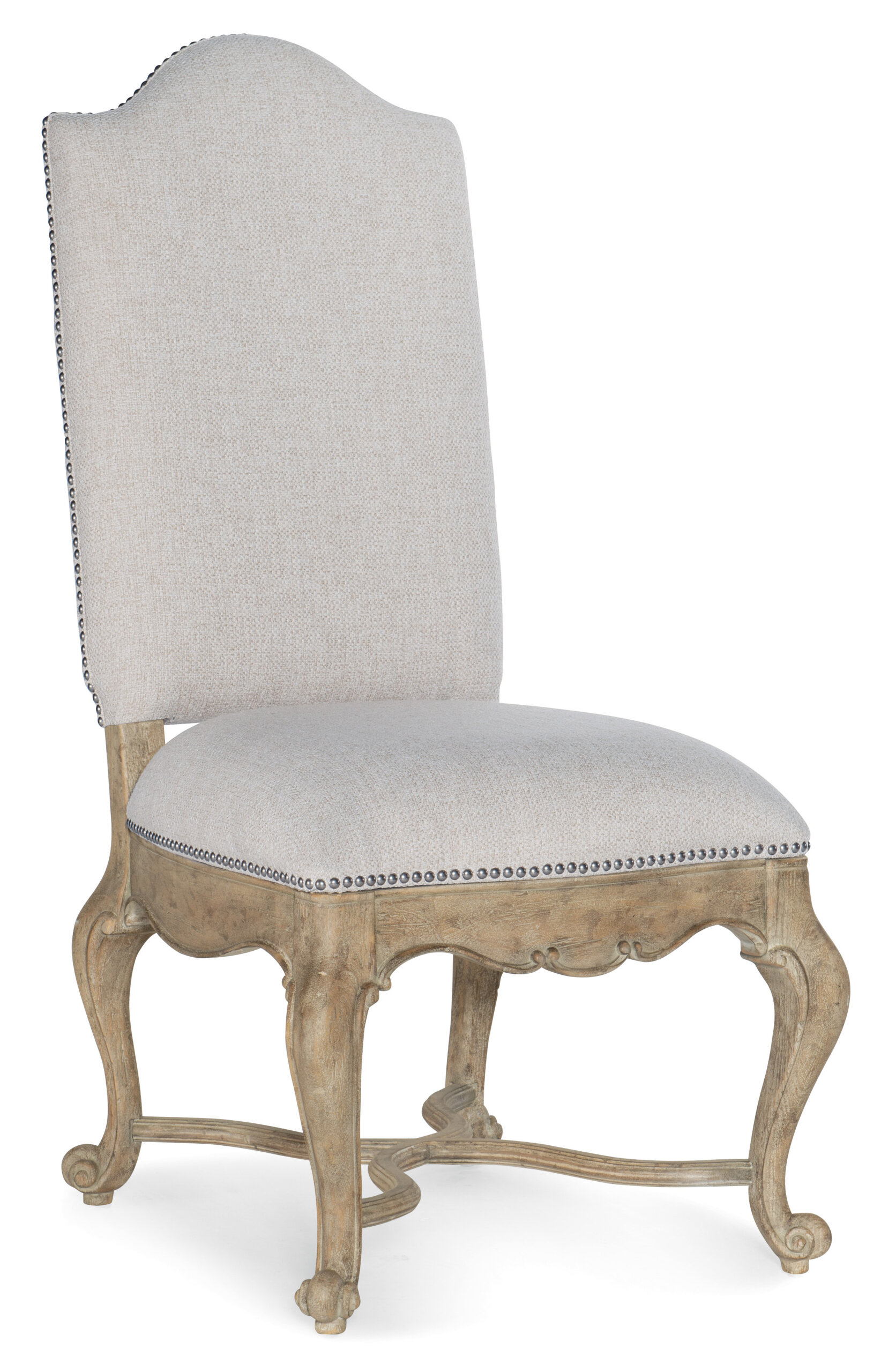 Celebrate gracious living with the romantic Castella Upholstered Side Chair with a lovely scalloped apron that is mirrored on the scallop-shaped upholstered back. The luminous and fresh Antique Slate finish with a rustic reclaimed appearance adorns the carved cabriole legs and serpentine stretchers. The soft upholstery in a creamy performance fabric creates a serene neutral color palette to add relaxation to your gatherings around the table or in the family room.