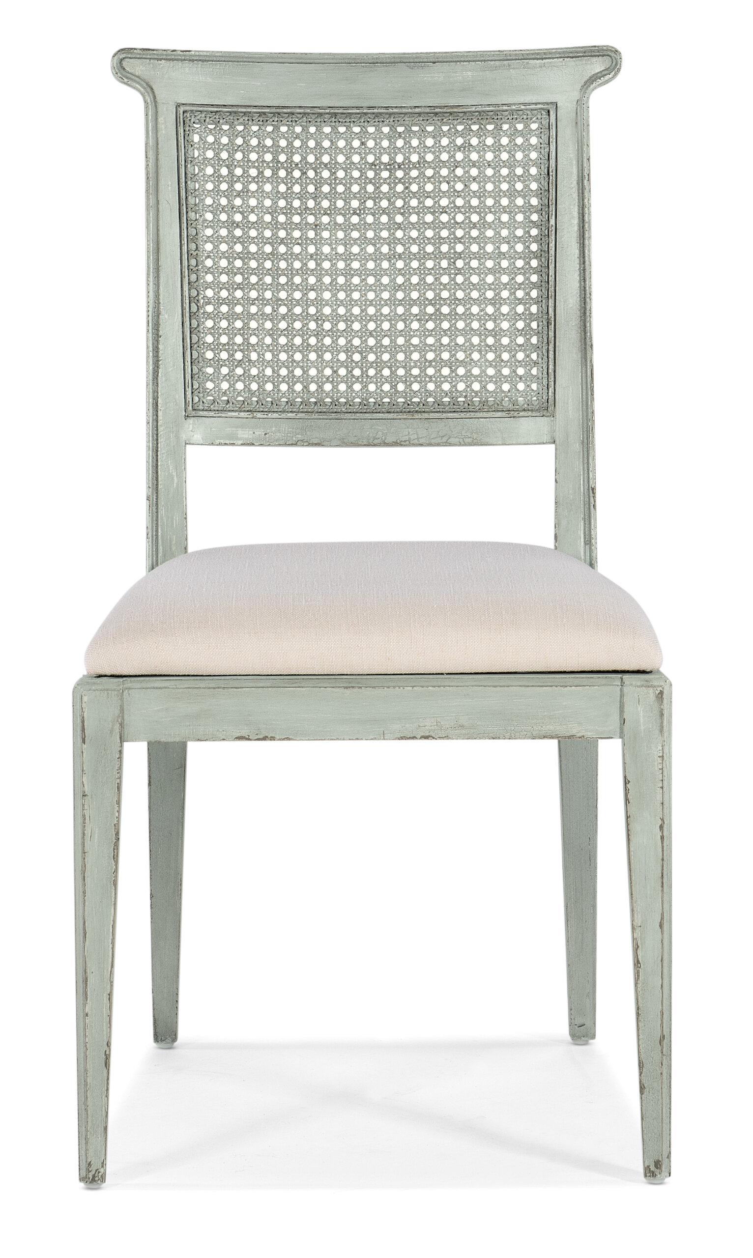 Inspired by the tropical craftsmanship of the West Indies and the woven cane accents of classic British and Dutch Colonial design, the Charleston Upholstered Seat Side Chair has an oyster-colored fabric seat and a cane back. The finish is Haint Blue, a soft color which can be found on the ceilings of porches and entryways, window shutters and doors in the American South, dating back more than 200 years from the Gullah folklore that held the color kept “haints” or spirits from entering homes and dwellings.