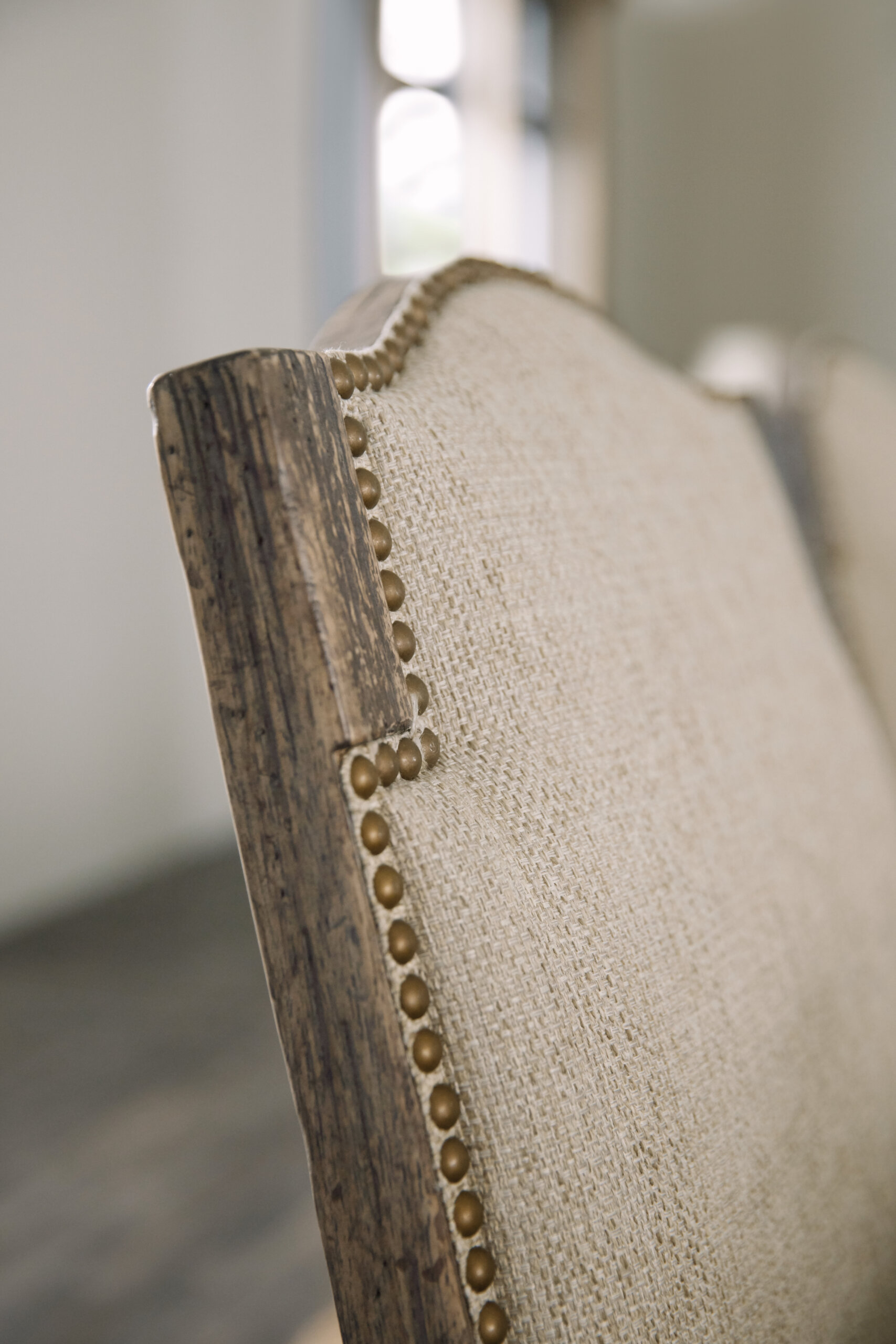 With its craftsman-like turned legs joined by a stretcher, elegant arched square back and reclaimed wood look, the Kruschel side chair would be at home everywhere from a regal ranch house in Texas to a country inn on the Great Plains to a grand estate. The seat and back are upholstered in an oat-colored fabric outlined in nailhead, and the Barnwood finish is a multi-tone brown emulating reclaimed wood.
