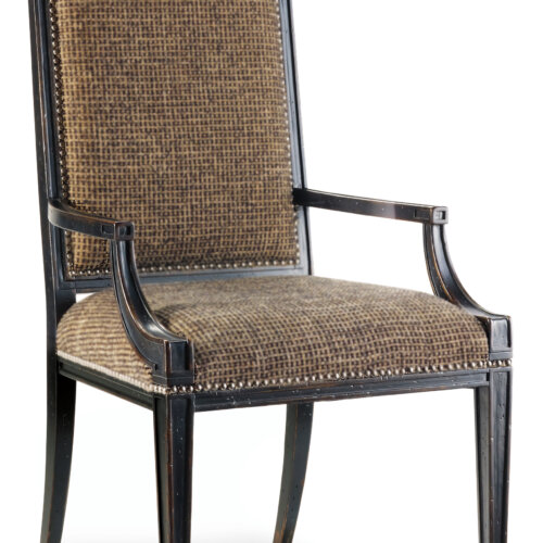 While the Insignia Arm Chair has an insignia pattern on the front and back, the Side Chair is offered in a plain fabric without the insignia.