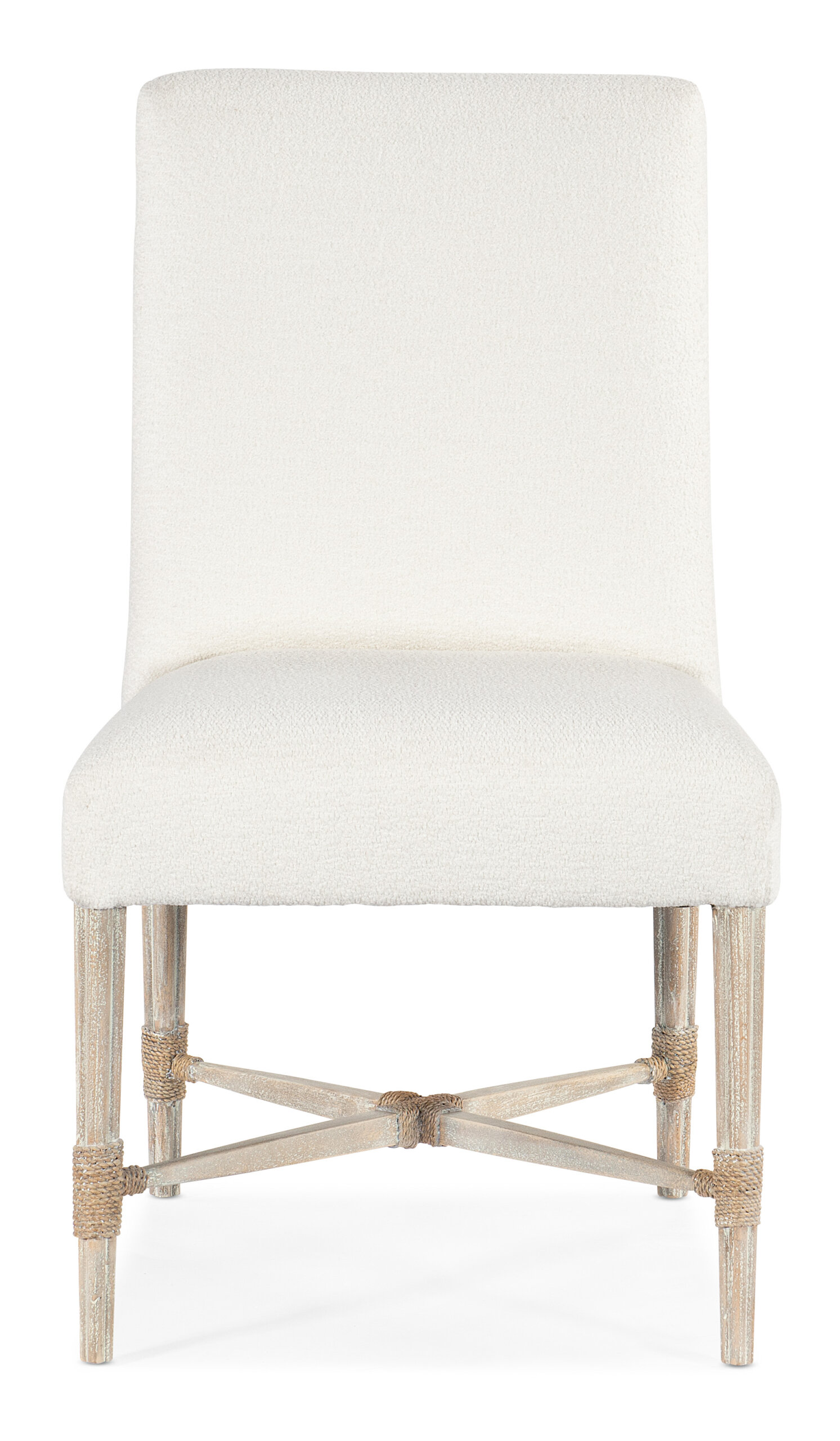Laidback and inviting, the Serenity Side Chair brings the relaxed aura of the outside in. With a comfortable seat and back covered in the Macrame Artic fabric, the side chair is crafted of Beech Wood with rope-wrapped arms and a stylish X stretcher base. The light and airy Surf finish is a whitewashed color.