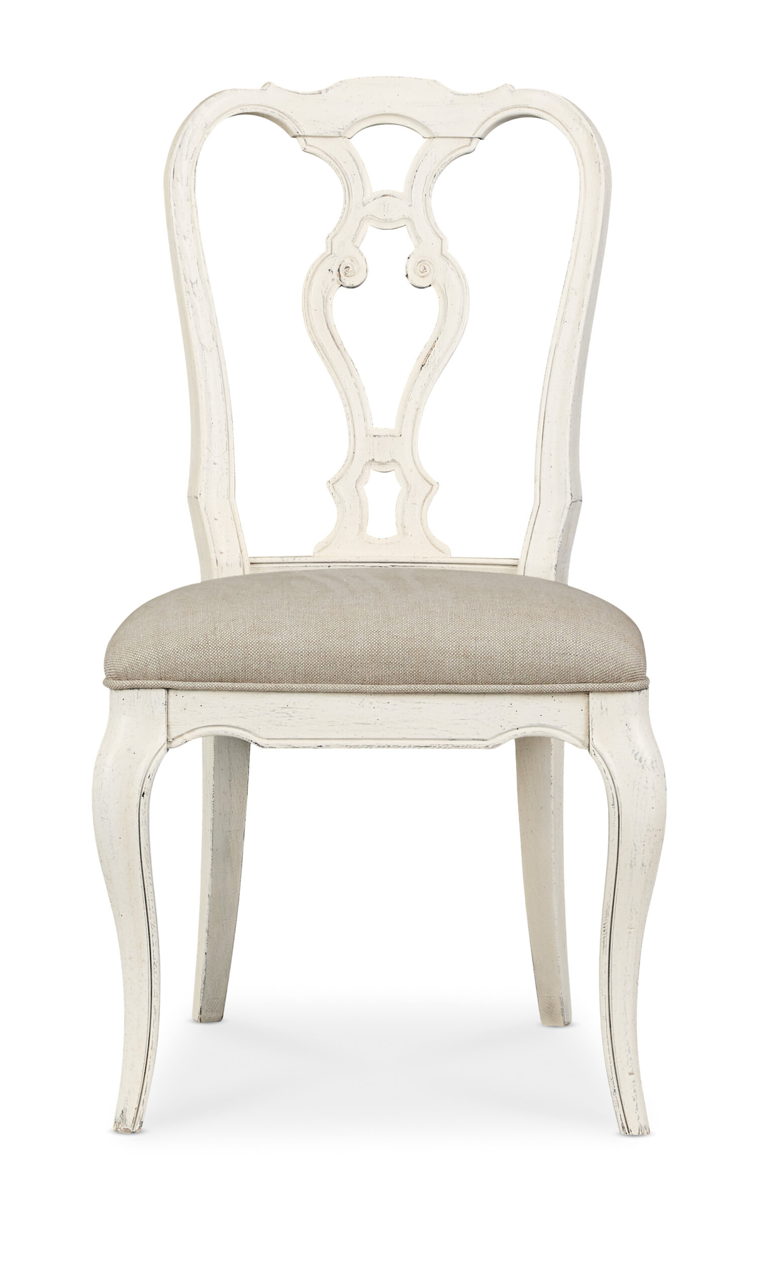 Classic and timeless, the Traditions carved splat-back wood dining chair is aspirational and inviting. In a soft white Magnolia finish, the seat is upholstered in a biscuit-colored 100% Linen performance fabric.