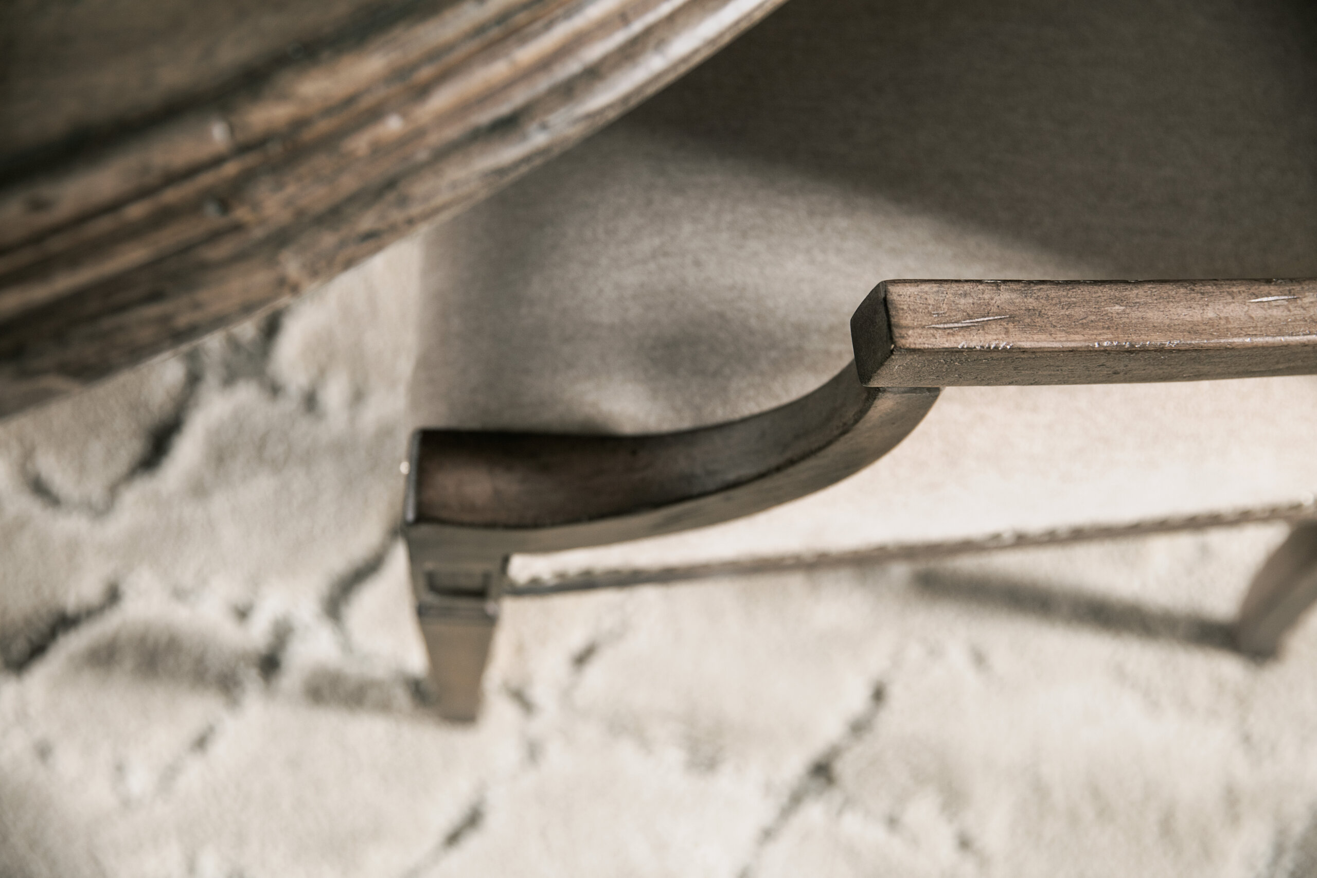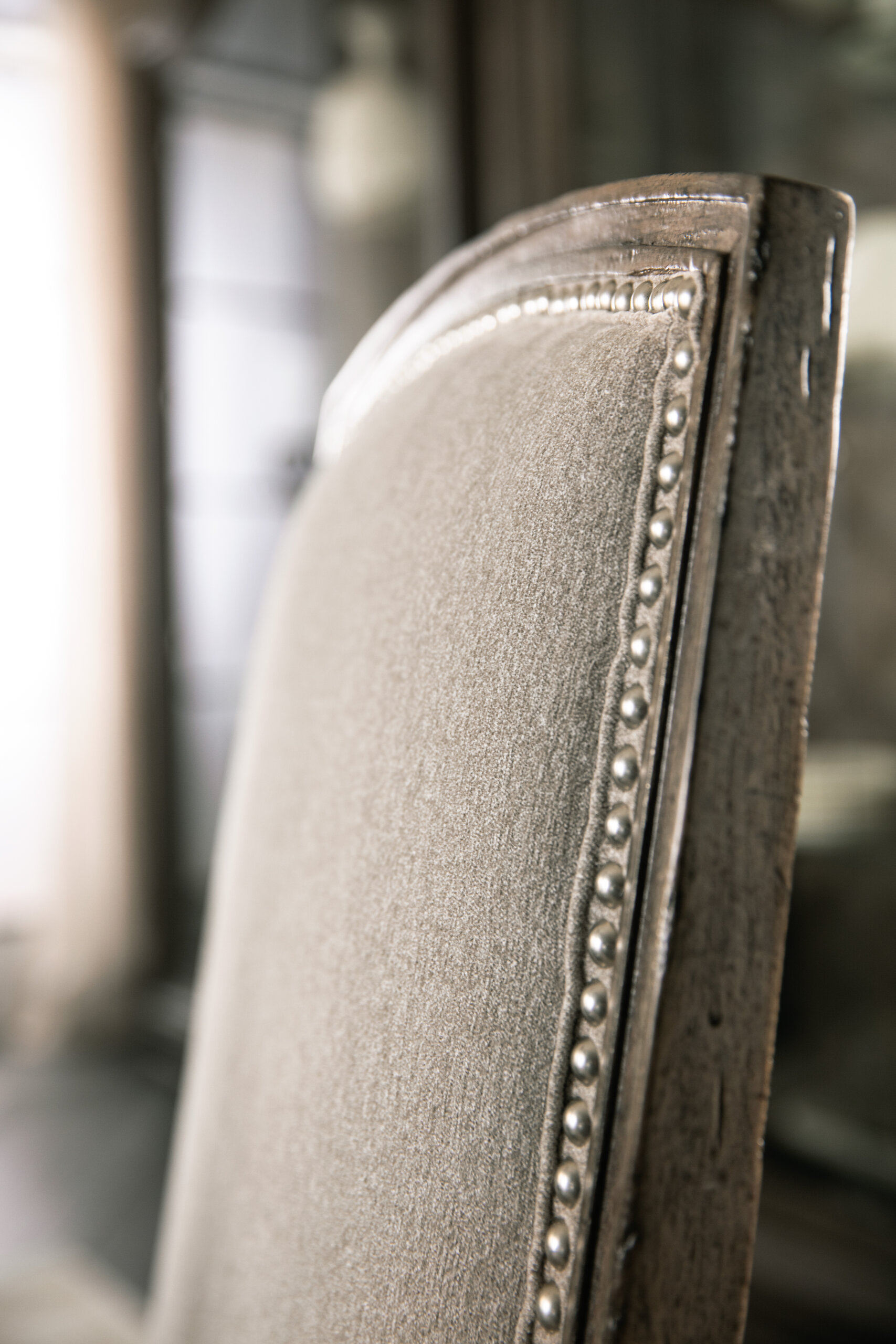 The graceful silhouette of the Woodlands Arched Upholstered Arm Chair invites you to experience easy elegance. The seat and inside back are upholstered in Lenox Taupe and accented with nailhead trim, while the outside back is upholstered in Smoked Herringbone, giving a textural two-tone appeal. The finish is Heathered Lambswool, a rich neutral that walks the line between taupe and gray.