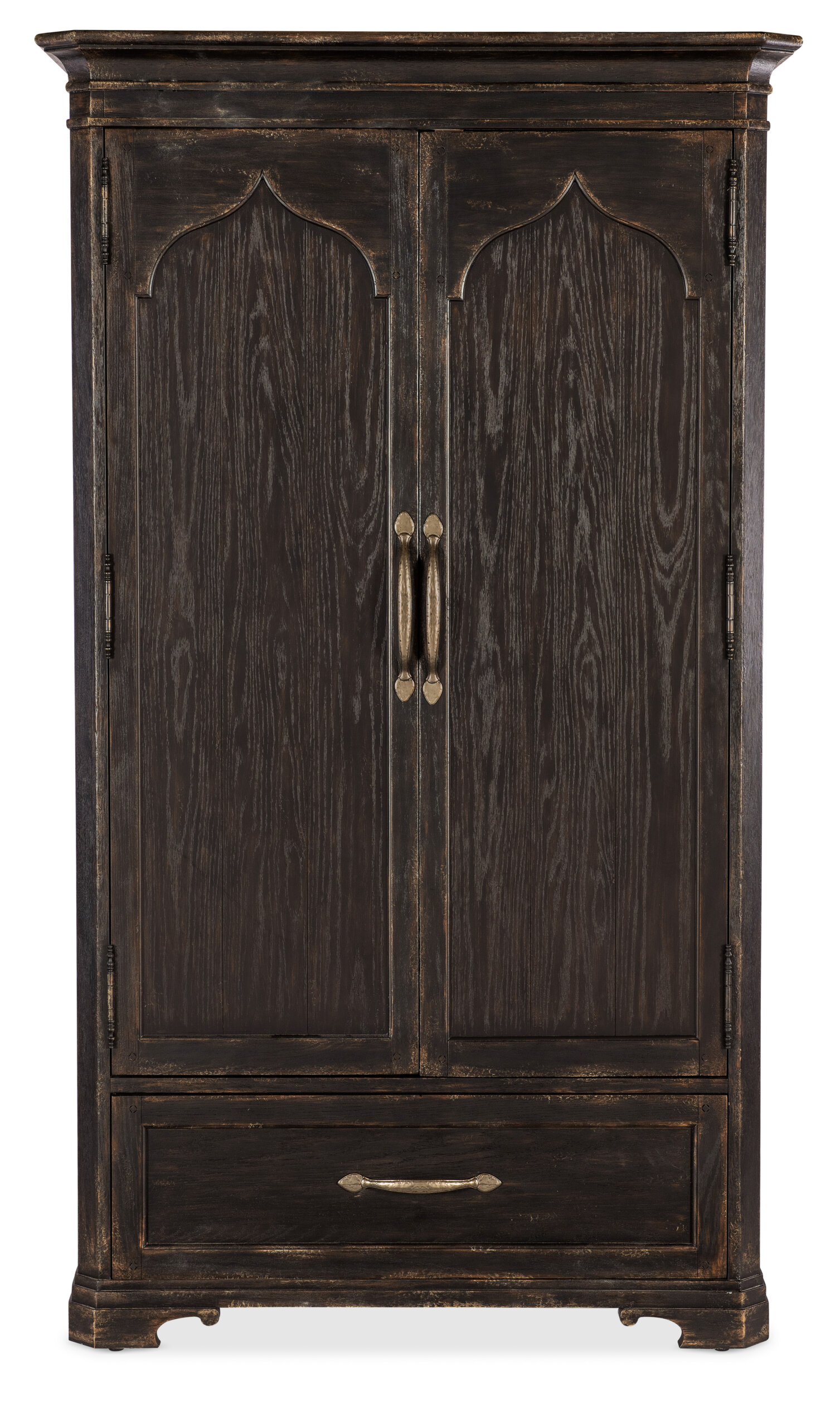 Reimagining an historical piece with a fresh take on finish, function, hardware and form, the Americana Wardrobe has shaped carved door fronts with an architectural arched design and scroll accents on the base. Crafted of Oak Veneers, it is finished in the time-worn white Daisy with a warm Honey interior finish. There’s mirrored glass on the interior of the doors, one removable clothing rod, two adjustable wood shelves and 3 self-closing drawers. The top left drawer has black removable felt liner and the top right drawer has a black felt liner and black removable felt-lined jewelry tray. The one bottom drawer is self-closing.