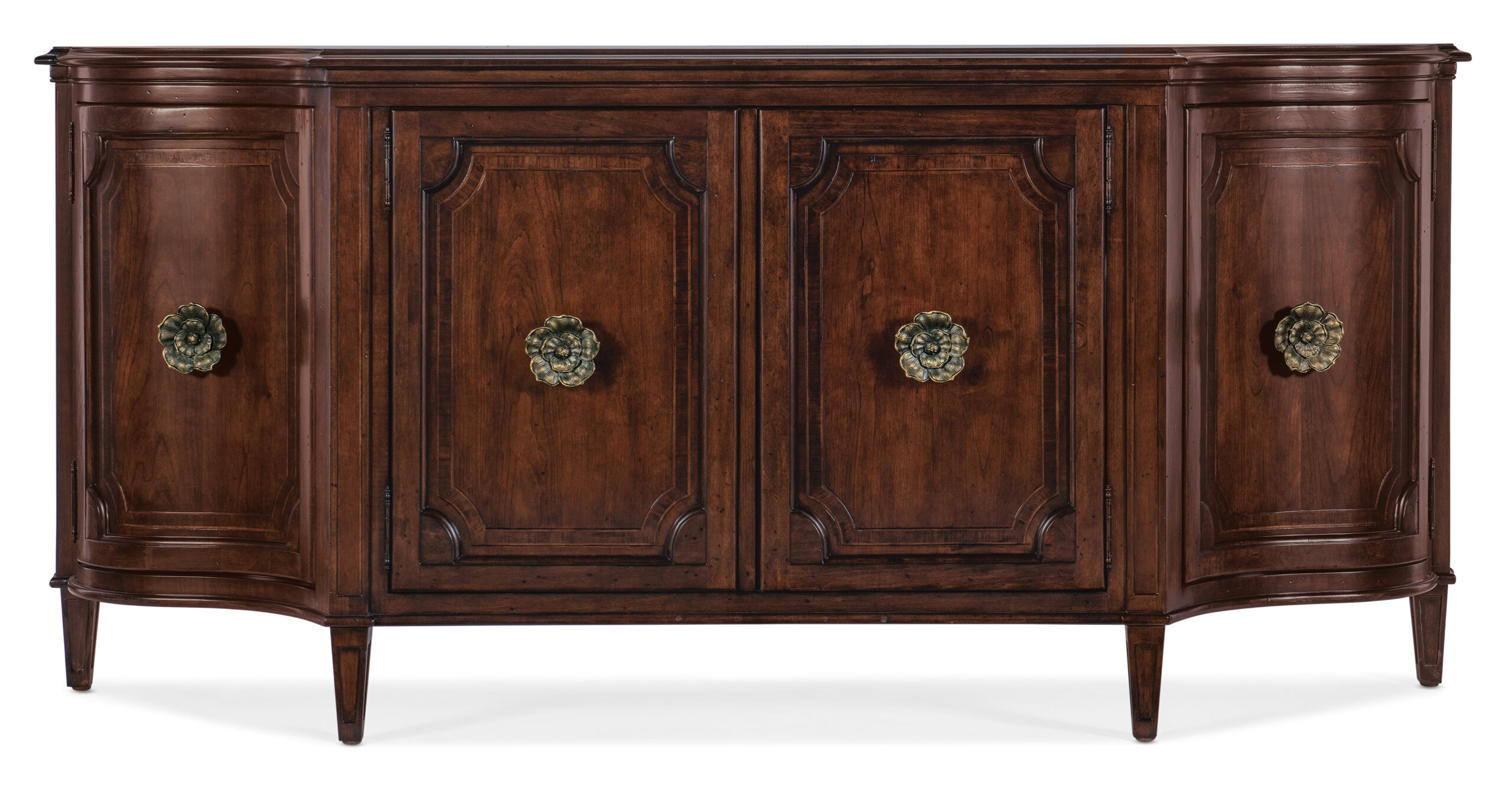 Heirloom quality meets a fresh traditional design interpretation and modern functionality in the Charleston Four-Door Buffet. Crafted of Cherry, Maple and Walnut Veneers with exquisite Maple Inlay and a Solid-Wood Edge top, the buffet is finished in the vibrant Maraschino Cherry, finished using natural grain Cherry Veneers showcasing the dramatic cathedral structure with the selective inclusion of naturally-occurring knots to deliver a rich warm cherry finish and smooth sophisticated aesthetic. Behind the two center drawers is one self-closing tray drawer and one adjustable shelf. Behind the left and right-side doors is an adjustable shelf, and there’s a removable felt-lined silverware tray in the drawer. The custom magnolia floral decorative pulls in an antique bronze color add a sparkle of beauty.
