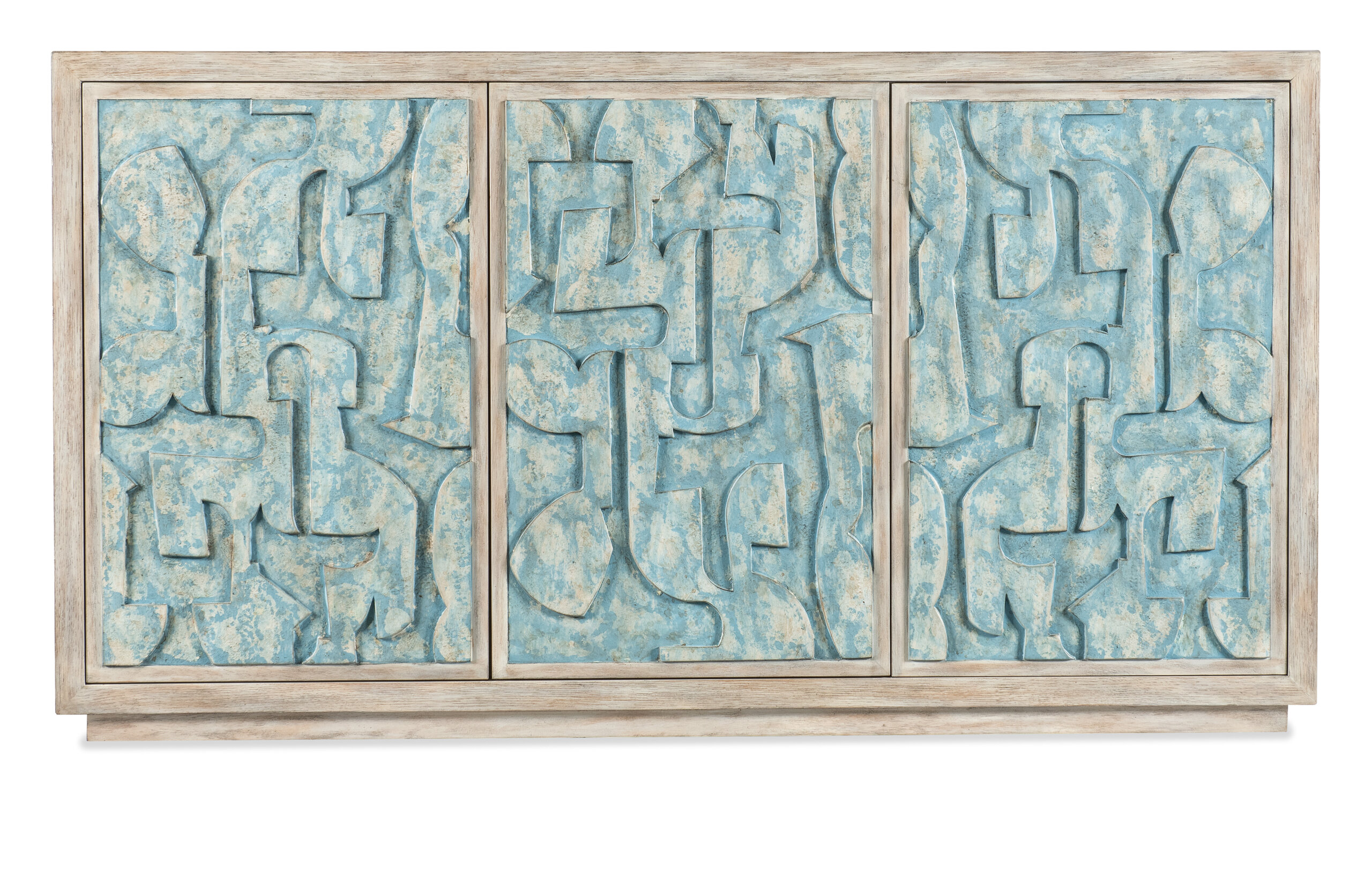 Create a refreshing modern resort vibe for your space with the Pikaso Credenza. Crafted of Oak Veneers and Resin, it features a white finish with rub-through and distressing and blue pained door fronts over a raised abstract pattern. The 3 doors have magnetic catches, and there’s one adjustable shelf behind the left side door and one adjustable shelf behind the right-side door. The back panel has ventilation and wire management holes.