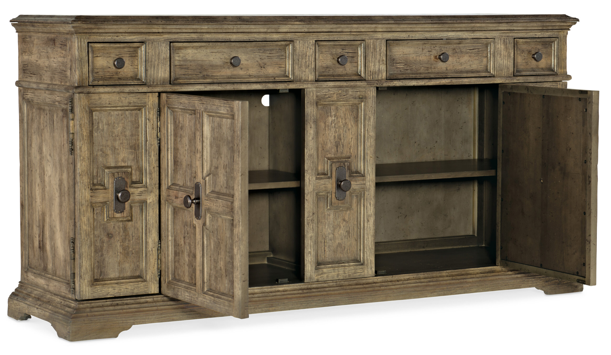 With artful use of symmetry, the Homan Buffet is a striking silhouette with exquisitely framed doors, bracket-shaped feet and dramatic gunmetal-colored hardware. Crafted of Poplar and Hardwood Solids with Pecky Hickory Veneer, the multi-tone brown Barnwood finish projects the look of reclaimed wood. This functional piece has two double-hinged doors, 3 small drawer and two large drawers. All drawers have drop-in felt liners, and the large drawer offers silverware storage.