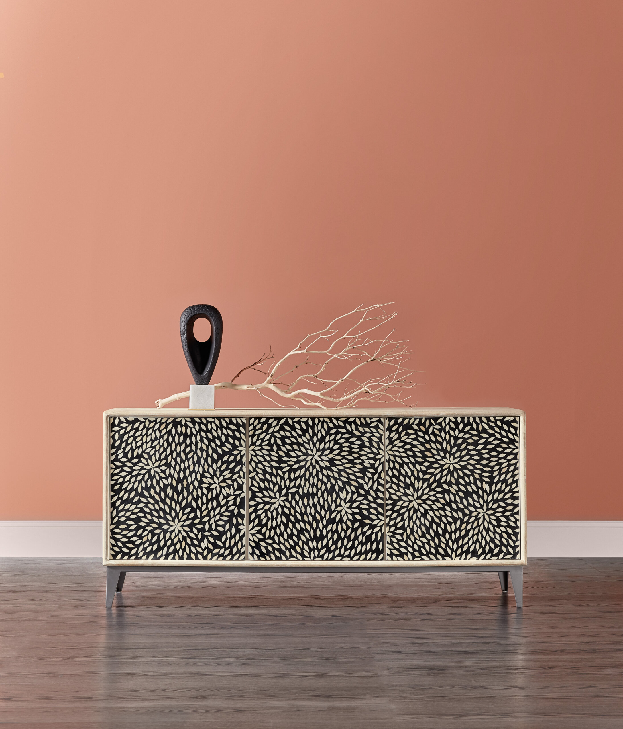 It’s contemporary and fresh, yet an instant classic with its delicate organic black and white pattern. Crafted of Mango Wood with Bone Inlay and a gray iron base, the Petrina is focal-point worthy. The 3 doors have bone inlay fronts and touch latches and one removable shelf behind each door. Ventilated back panel.