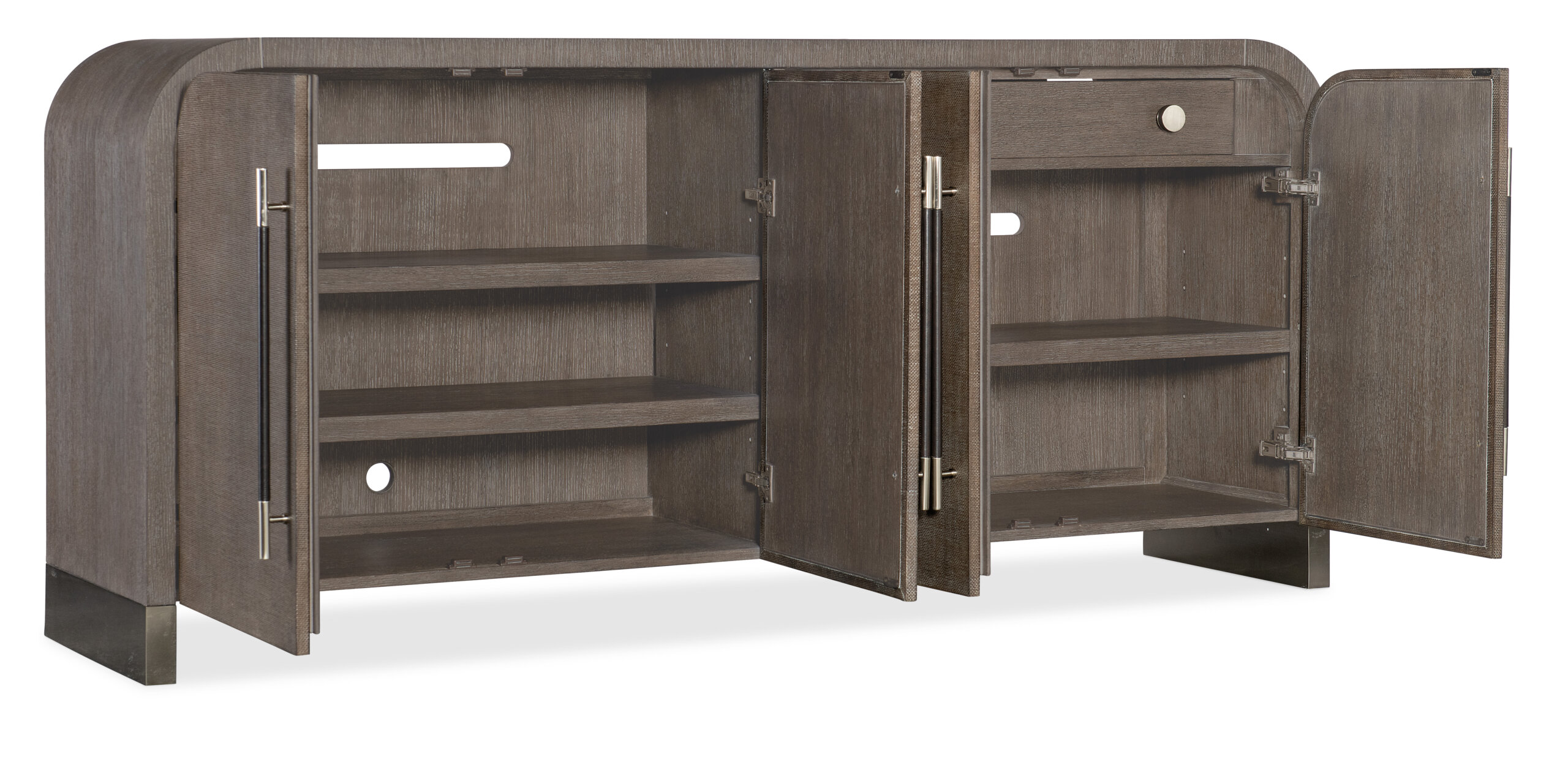 Sleek and stunning with a timeless sophistication and soft modern aesthetic, the Modern Mood Buffet combines Quartered Oak Veneers with raffia-wrapped doors, warm pewter brushed metal bar pulls accents. The Mink Finish has dark, earthy brown hues with notes of black, offering a serene style. Features include 4 doors with soft-close hinges and magnetic catches, two adjustable wood shelves behind each pair of doors, ventilated back panels and wire management holes in the back panel and a 3-plug electrical outlet behind the right-side doors.