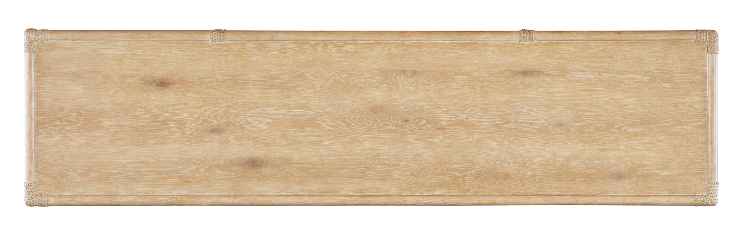 With a laid-back island vibe and mix of organic materials, the Retreat Pole Rattan Sideboard is crafted of Oak and Maple Veneers with rope accents at the joints. The light sand-colored Dune finish is transparent by design to reveal the unique grain patterns of the wood veneer. Featuring ample storage, the sideboard has two doors with magnetic door catches with one adjustable shelf behind each door. There are two self-closing drawers, and the top drawer has a removable felt liner and removable silverware tray. The lower fixed shelf is ideal for display or storage. Soft pewter bar pull and “T” pulls on the doors add a distinct accent.
