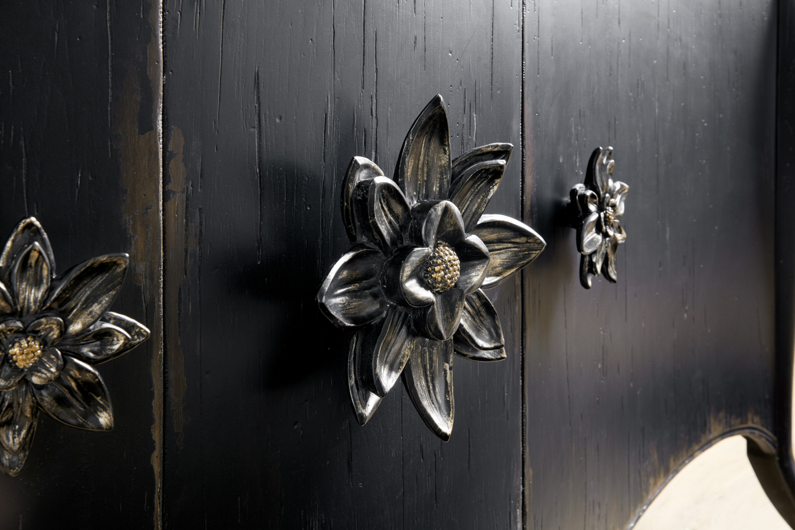 Porte Noir: a dark, black painted finish rich brown undertones, rubbed to a medium sheen, with areas of heavy rub thru and distressing to review a honey tone wood color. Distressing includes drawknife, wormholes and rasping. Decorative flower hardware.