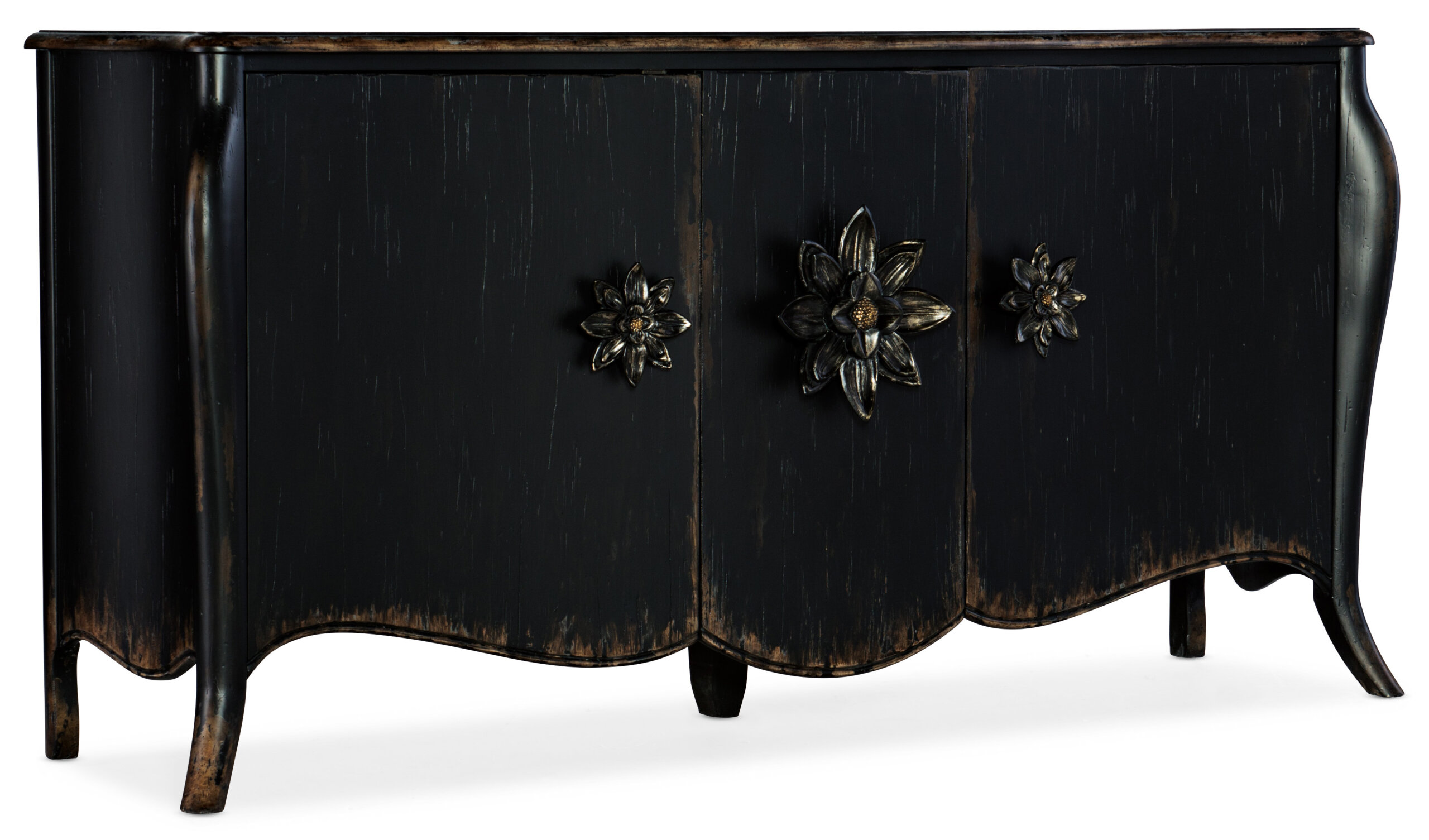 Absolutely captivating, the Bien Ame Buffet is a luxurious piece that is approachable and inviting. With classic bones, the 3-door buffet features a shaped apron and cabriole legs and delightful decorative floral hardware. Crafted of Poplar and Hardwood Solids with Oak Veneers, it is finished in Porte Noir, a black paint with rich brown undertones with areas of heavy rub through and distressing to reveal a honey tone wood color. Doors have soft-close hinges, and there is one adjustable shelf behind each door.