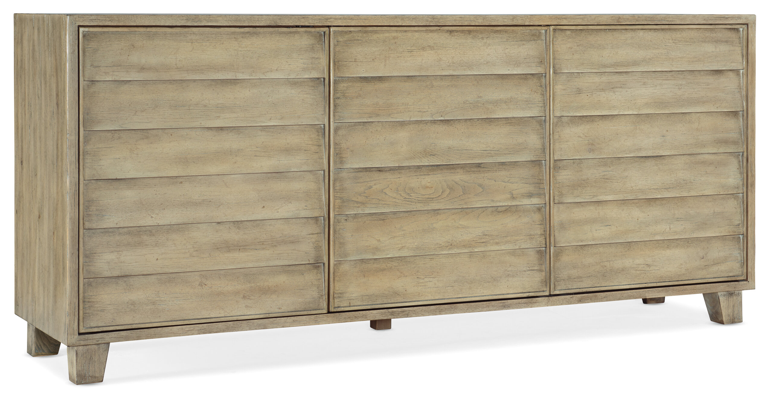 Epitomizing the lifestyle of a casual, beach-town community, the Surfrider Buffet strikes a serene profile with resort-inspired shutter-like door fronts. The buffet features 3 doors with magnetic catches and soft-close hinges and two self-closing drawers behind a left pair of doors. The left drawer has a removable drop-in felt liner, and the right drawer has a removable felt silverware tray. There’s one adjustable shelf behind the left pair of doors and two adjustable shelves behind the right door. Crafted of Quartered Pine and Maple Veneers with a Solid-Wood edge top and finished in the light natural Driftwood finish.