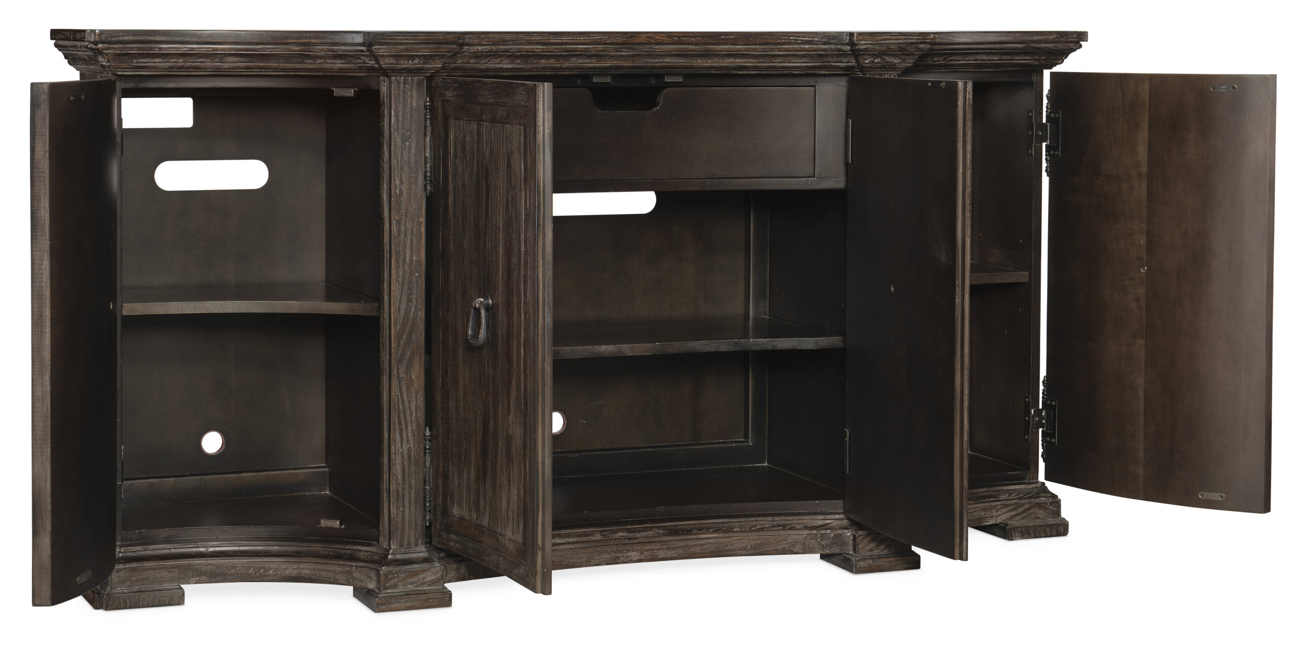 Inspired by 19th Century furnishings of the Tuscany region, the shaped Traditions Buffet has block-style feet and aged pewter ring pulls that complement the elegant brown Maduro finish with grey undertones. Crafted of Pine, Oak and Maple Veneers, the buffet has 4 doors with one adjustable shelf behind each right and left door and one behind the pair of center doors. There’s a drawer behind the center doors with a removable black felt silverware tray. Ventilated back panel.