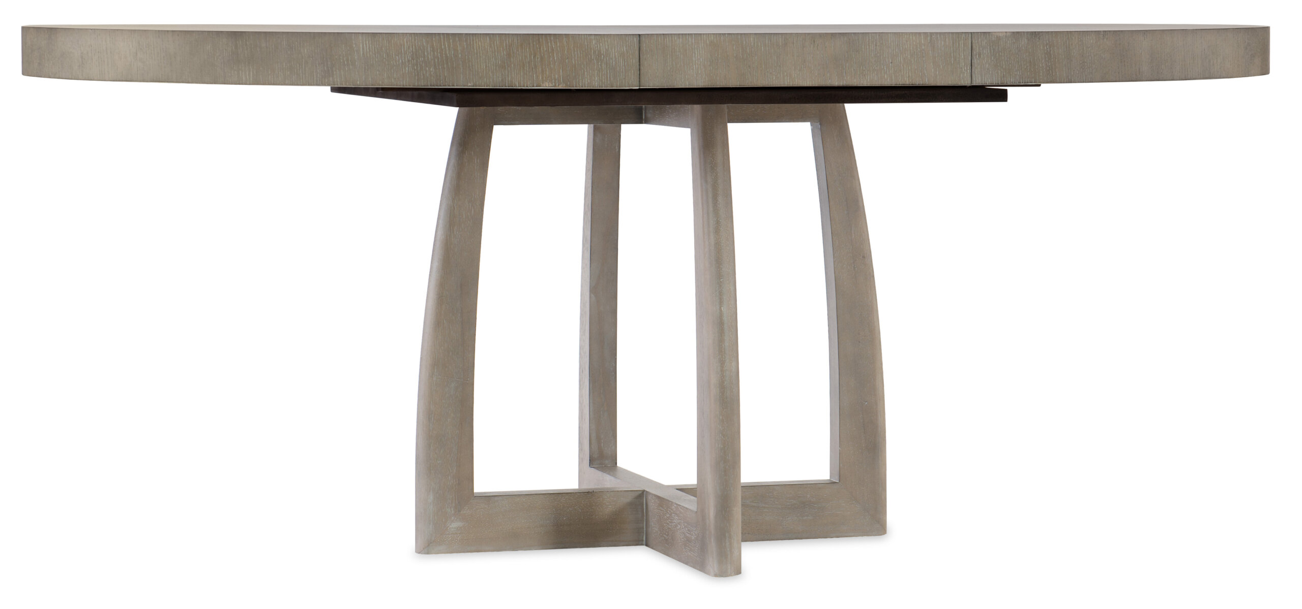 In a soft rounded form with wire-brushed greige and antique white finish on quartered White Oak, the Affinity 48-inch round table extends to 66 inches with the 18-inch leaf in place.