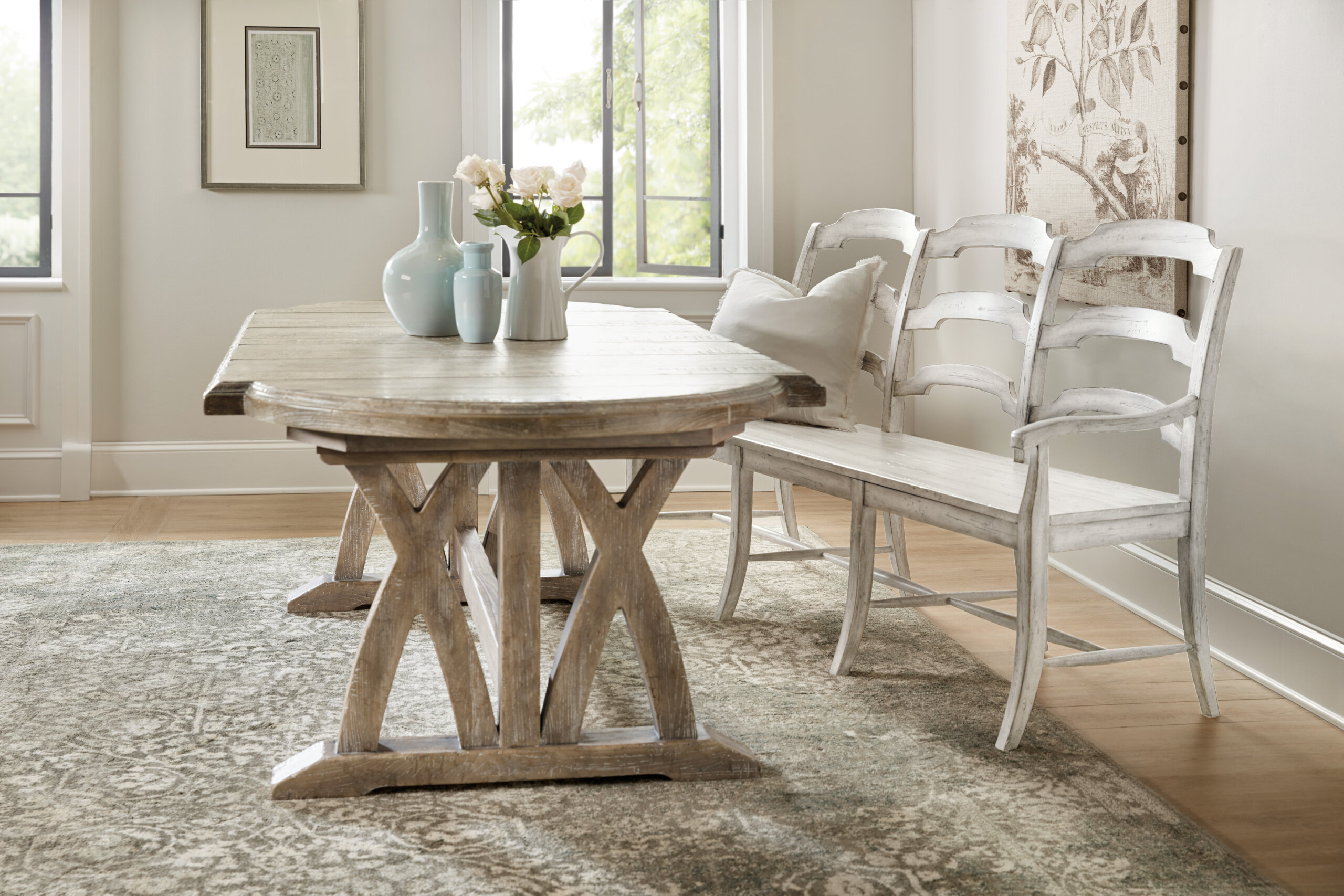 Be transported to a charming European cafe with the Colibri Trestle Dining Table with its distinctive four X bases. The light and airy finish is Antique Milk Paint, a light brown with nearly opaque milk-colored paint with a brushstroke effect, accented with hang up and distressing.