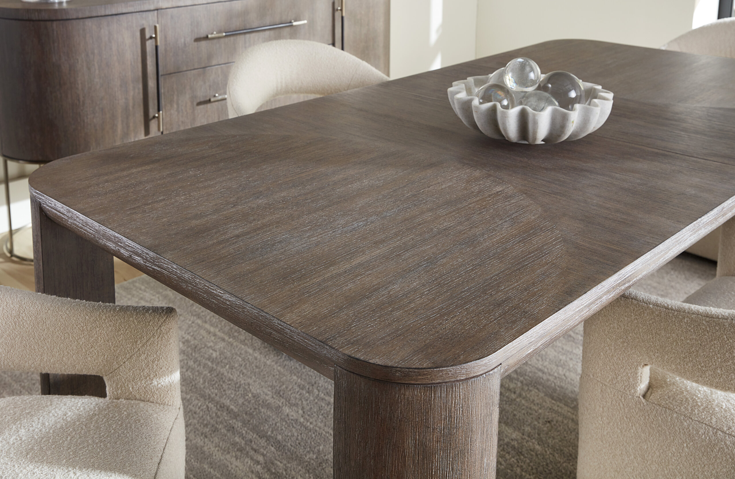 Unbound by geographical design, Modern Mood presents itself as an evolution of design choices, spanning a variety of decades and design movements, while maintaining an unmistakably modern aesthetic that transcends time. The 90-piece collection includes bedroom, dining room, home office, accent and occasional items characterized by substantive forms with soft architectural details. Elevated materials and brushed metal accents in a warm pewter finish are evident throughout the collection, including metal banding and edging as well as marble and glass accents. Crafted with flat cut quartered oak veneer with wire-brushed detailing, Modern Mood is presented in two finishes: Mink and Diamond. Delivering a dark, earthy brown with notes of black, Mink delivers a timeless aesthetic. A much lighter presentation is achieved with the crystal-like alabaster and pewter hues of the Diamond finish, delivering a soft sophistication.