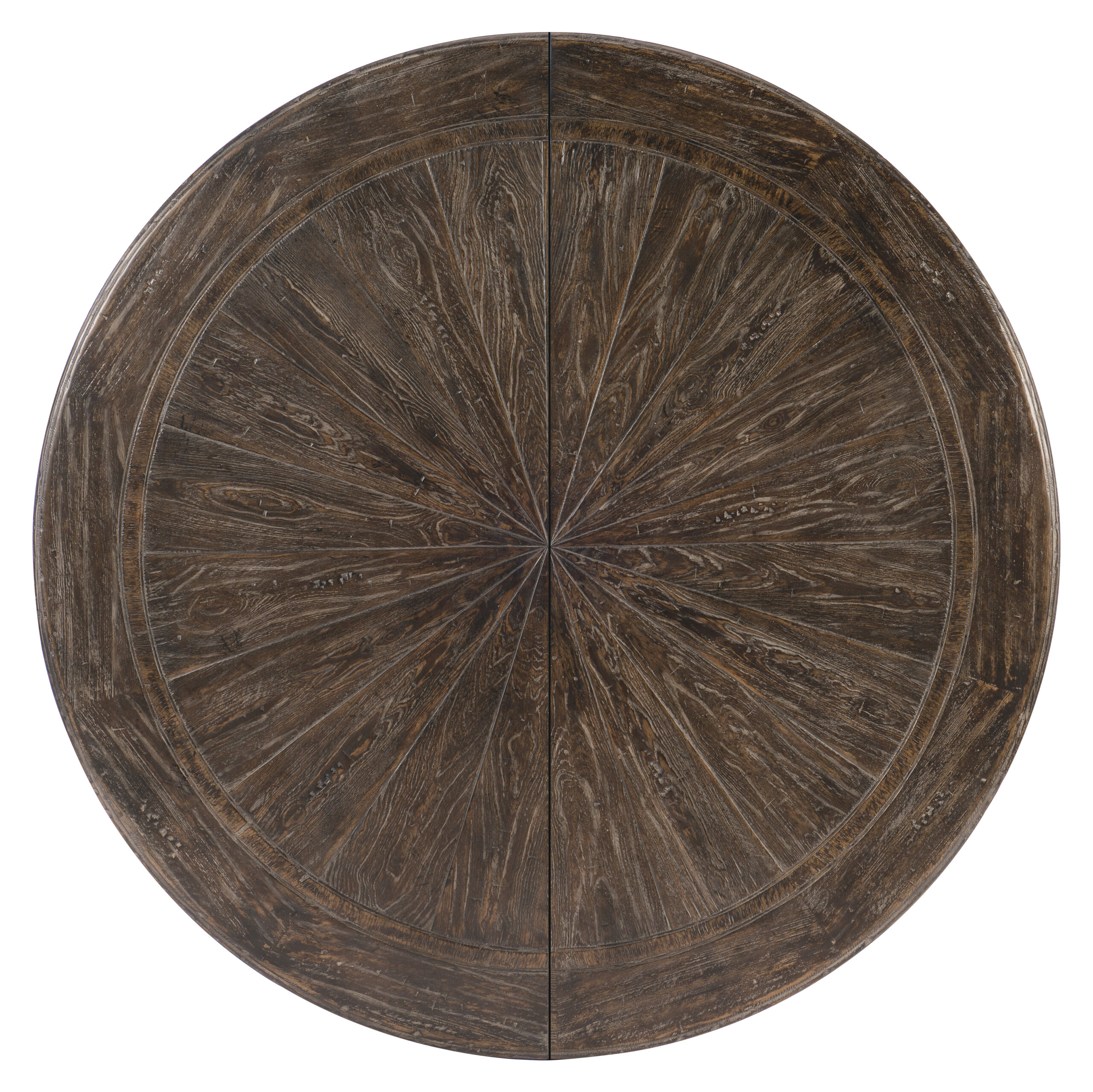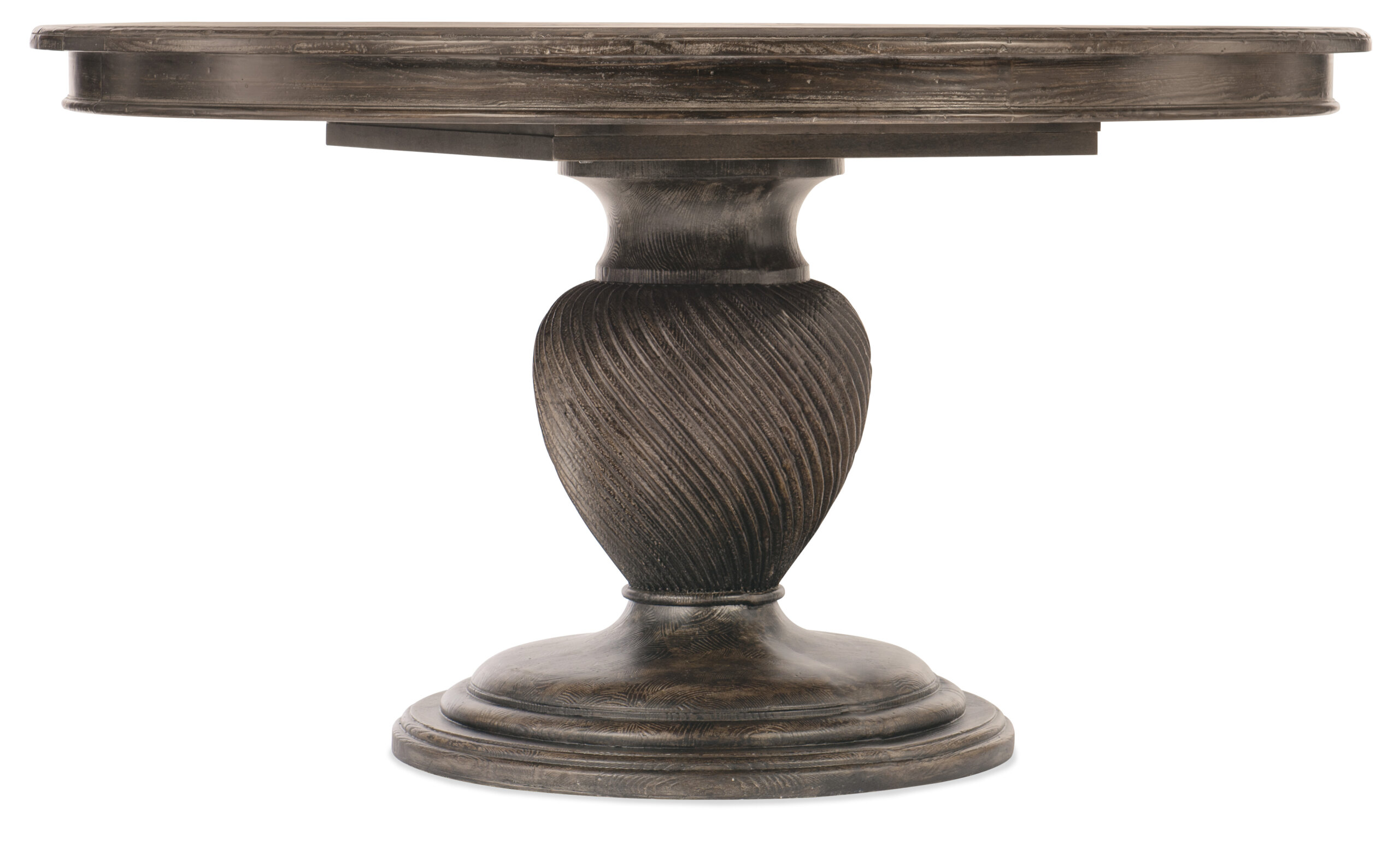 Inspired by antiques and architecture of vintage character, the 54inch round Traditions Dining Table has a charming twist-pedestal design. Crafted of Pine and Oak Veneers with a decorative Maple Inlay and Solid-Wood Edge Top, the table is finished in the rich brown Maduro color with grey undertones, and has one 20-inch leaf, extending it to 74 inches round to accommodate up to 6 matching chairs.