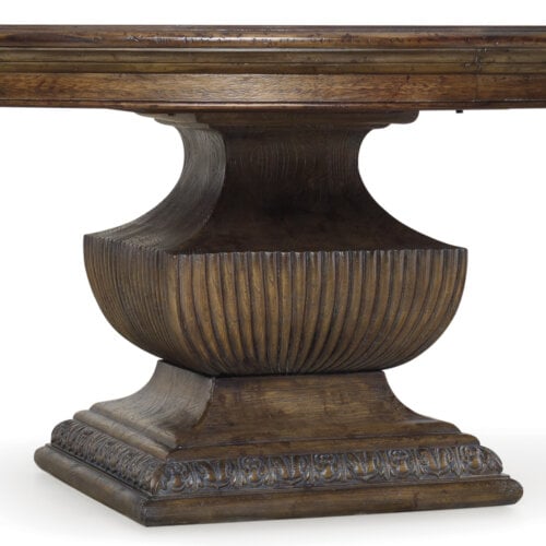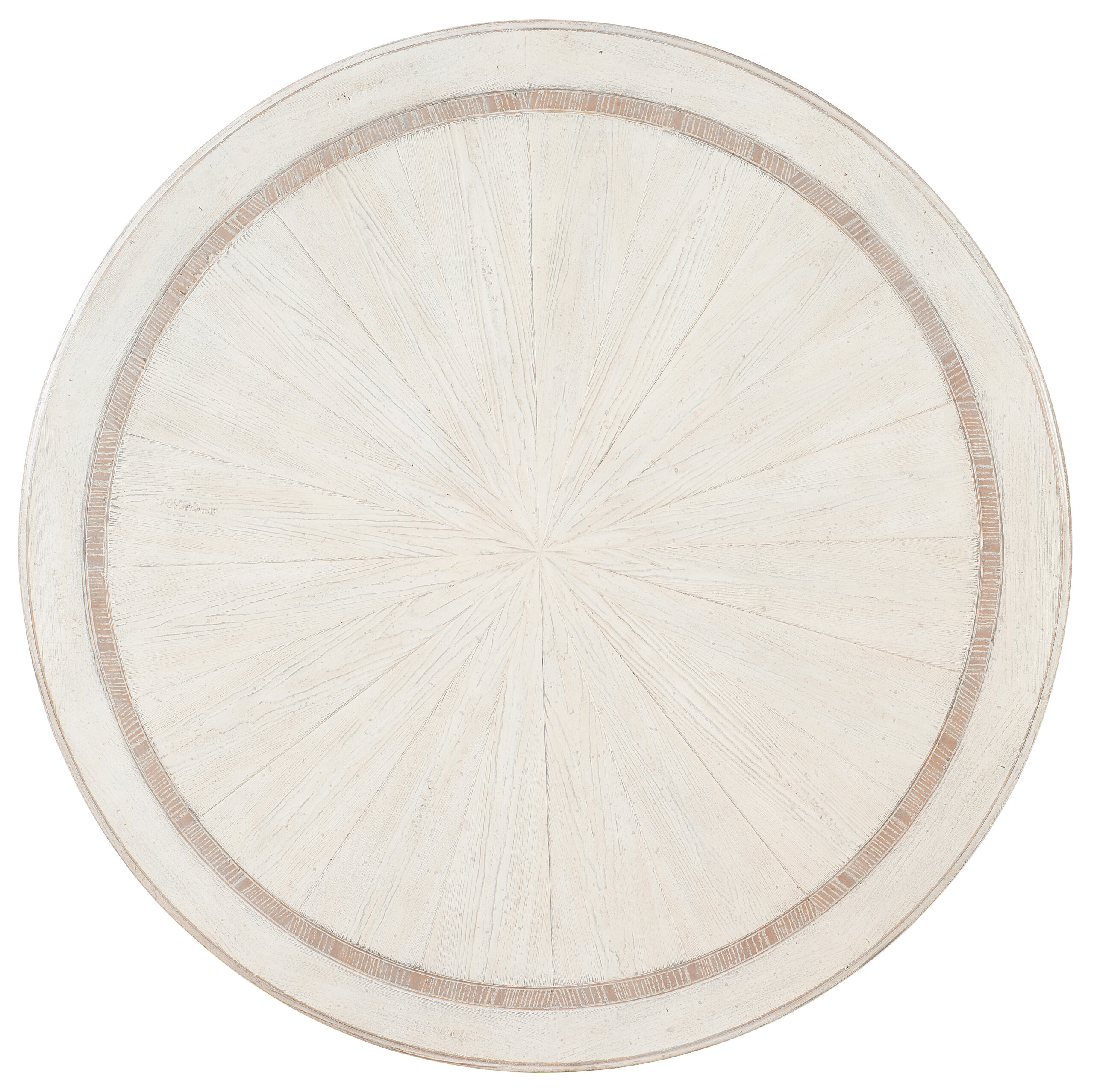 Inspired by antiques and architecture of vintage character, the 54inch round Traditions Dining Table has a charming twist-pedestal design. Crafted of Pine and Oak Veneers with a decorative Maple Inlay and Solid-Wood Edge Top, the table is finished in the soft white Magnolia color and has one 20-inch leaf, extending it to 74 inches round to accommodate up to 6 matching chairs.