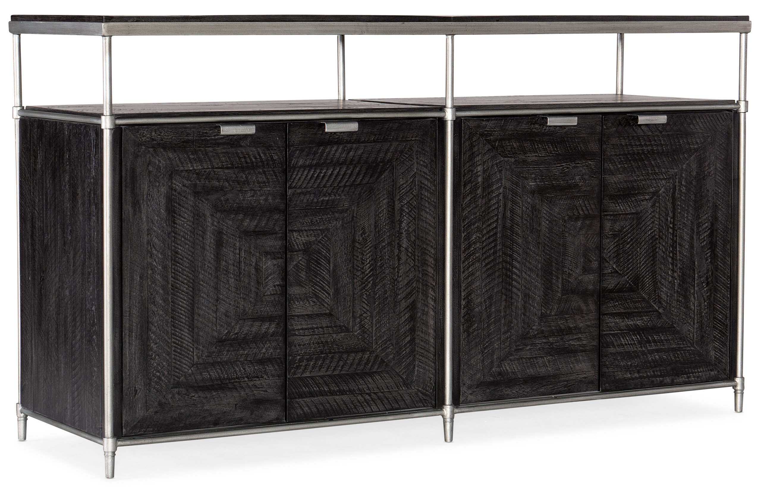 Authentic with an artistic character, the St. Armand Entertainment Console is crafted of Acacia Solid Wood in a distressed black finish with brushed pewter metal trim. Featuring 4 doors with soft-close hinges and one adjustable shelf behind each pair of doors, the console has a ventilated back panel, FC705 3-plug electrical outlet and accommodates up to a 60-inch TV.