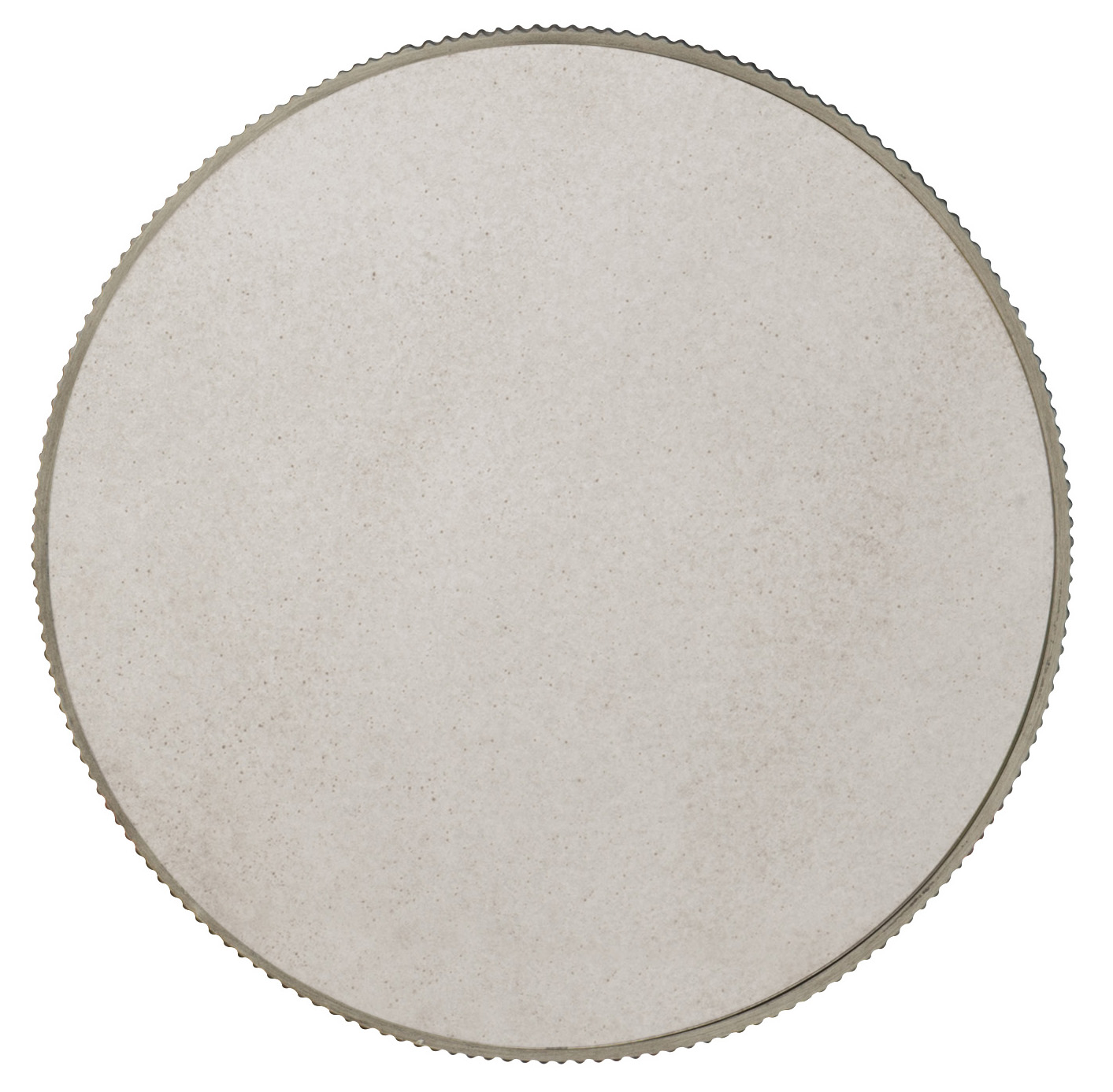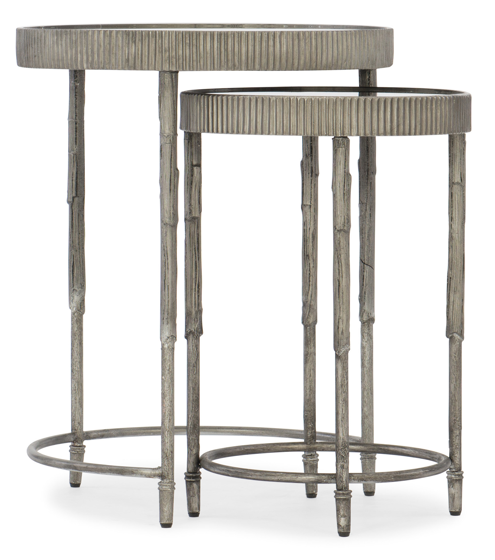 Organic and tactile, these accent nesting tables are rich in texture, crafted of iron and mirror with a silver finish over iron and a mirrored top. Add a glamorous modern twist to any space. The large table measures 19.5 inches in diameter and 24 inches high, while the small table is 14 3/8 inches in diameter by 19 ¾ inches high.
