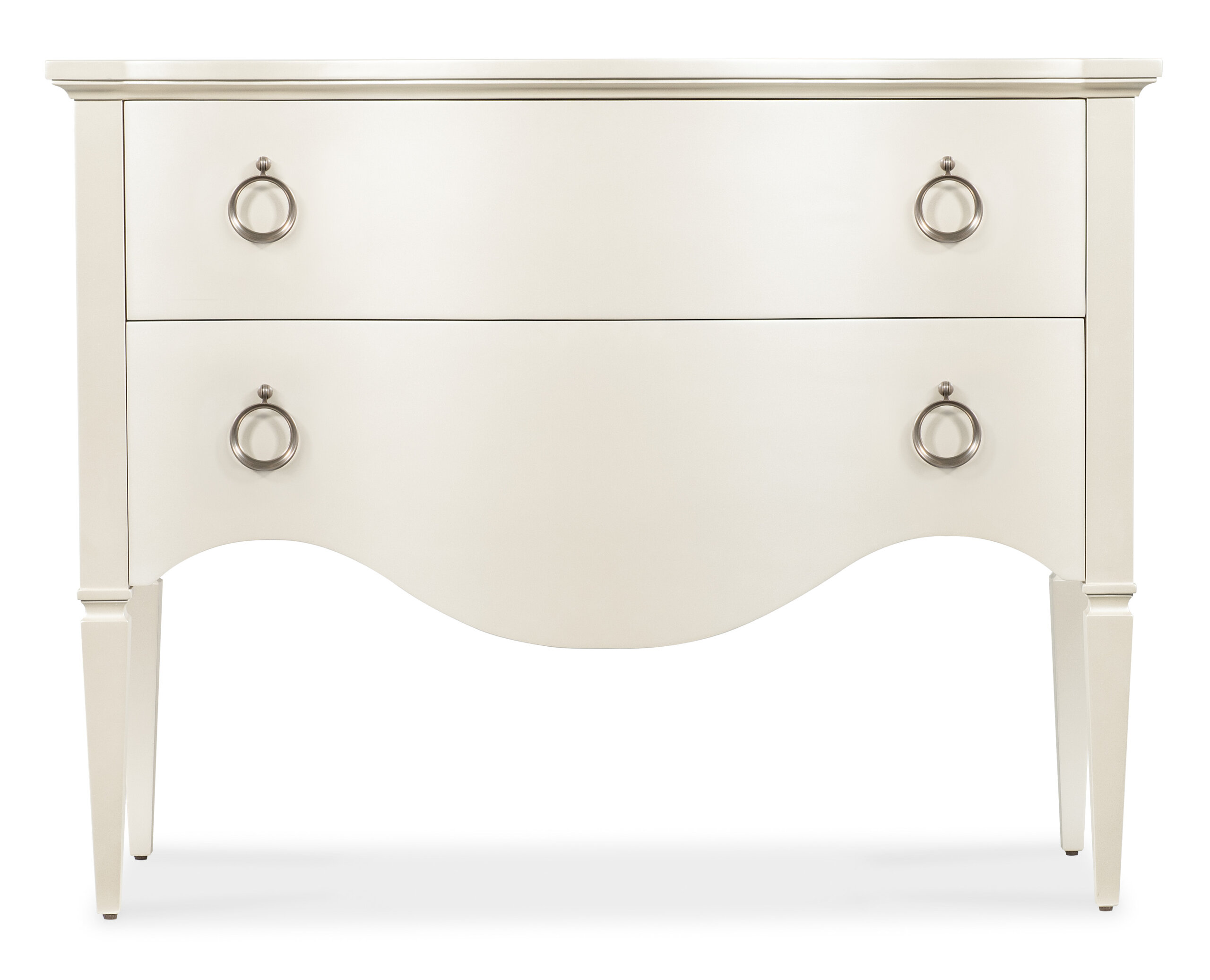 Sophisticated and glamorous, the Bella Donna Two-Drawer Chest has a serpentine shape and tapered legs with carved accents. Crafted of Cherry Veneers, it features the luminous Akoya finish, inspired by the purest white pearls found in the world. Metal alloy ring pulls in a champagne finish add an intriguing accent. Two self-closing drawers.