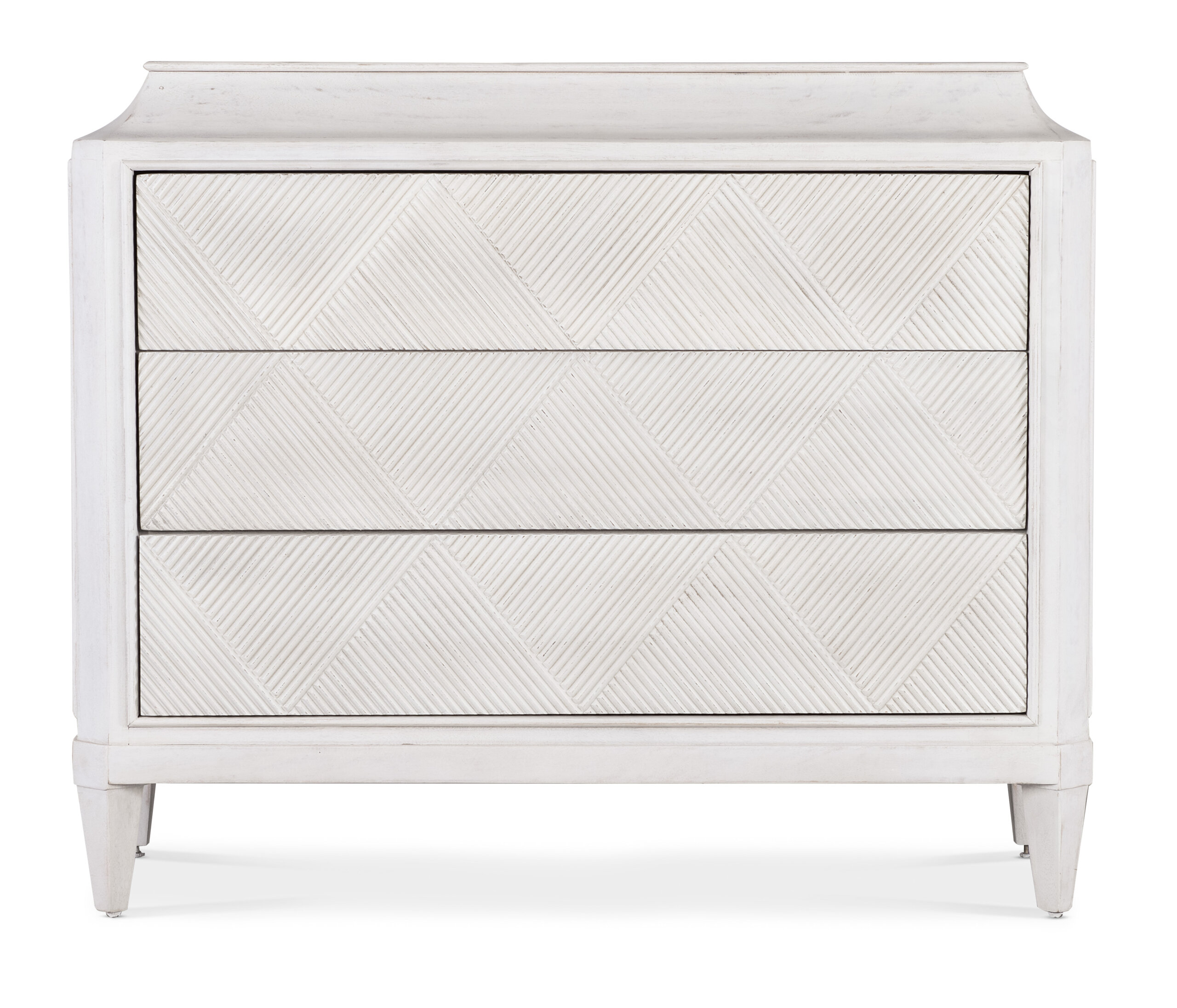 Proving that a white finish can be warm and inviting, the Argyle Chest combines a creamy white finish with textural carved grooved drawer fronts in an argyle pattern. The interior of the 3 drawers with push latches match the outside of the case. Tapered legs add an air of finesse. Crafted of Mango Solid Wood.