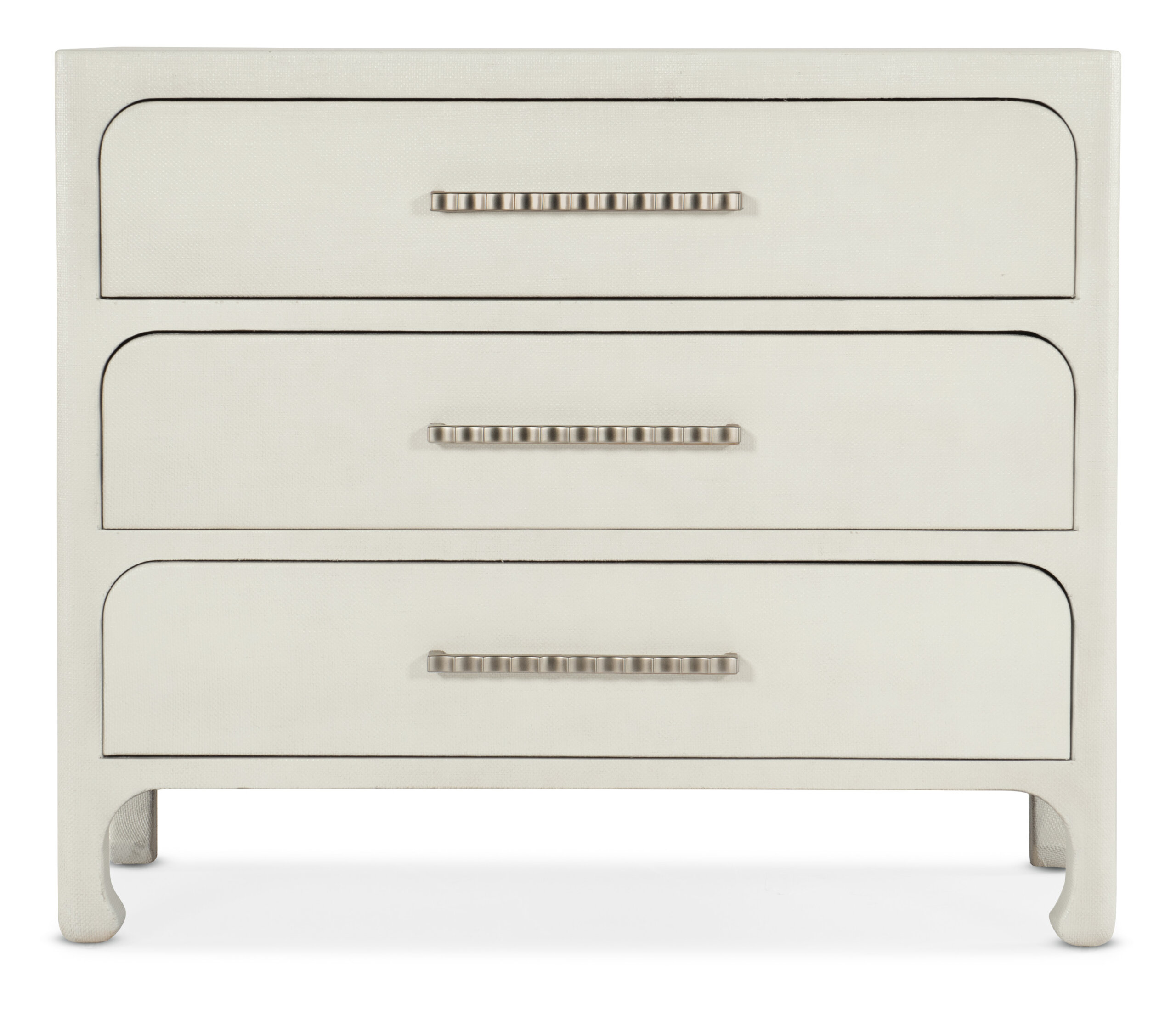 Inspired by casual waterfront living with a chic sophistication, the Cruiser Accent Chest is crafted of Wood and Raffia and finished in Sand Dollar, a white lacquered grasscloth. Chow-style legs and light champagne-colored decorative bar pulls add a designer touch.
