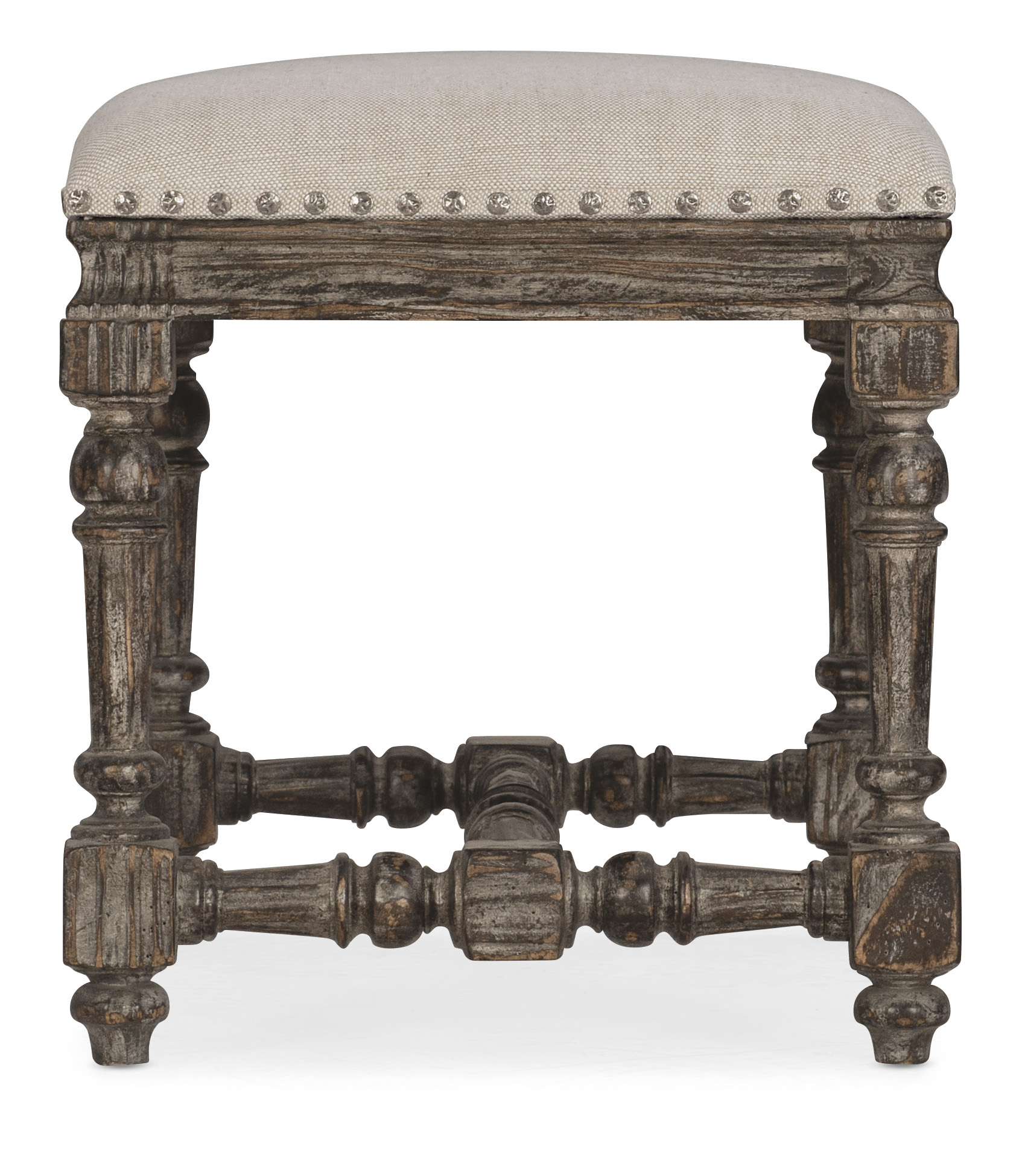 Inspired by European antiques and architecture, the Traditions Bed Bench features intricate details like turned legs and stretchers and nailhead trim around the base of the seat. Finished in the elegant brown Maduro finish with grey undertones, the seat is upholstered in Biscuit, a 100% Linen performance fabric from stain resistance and easy cleaning.