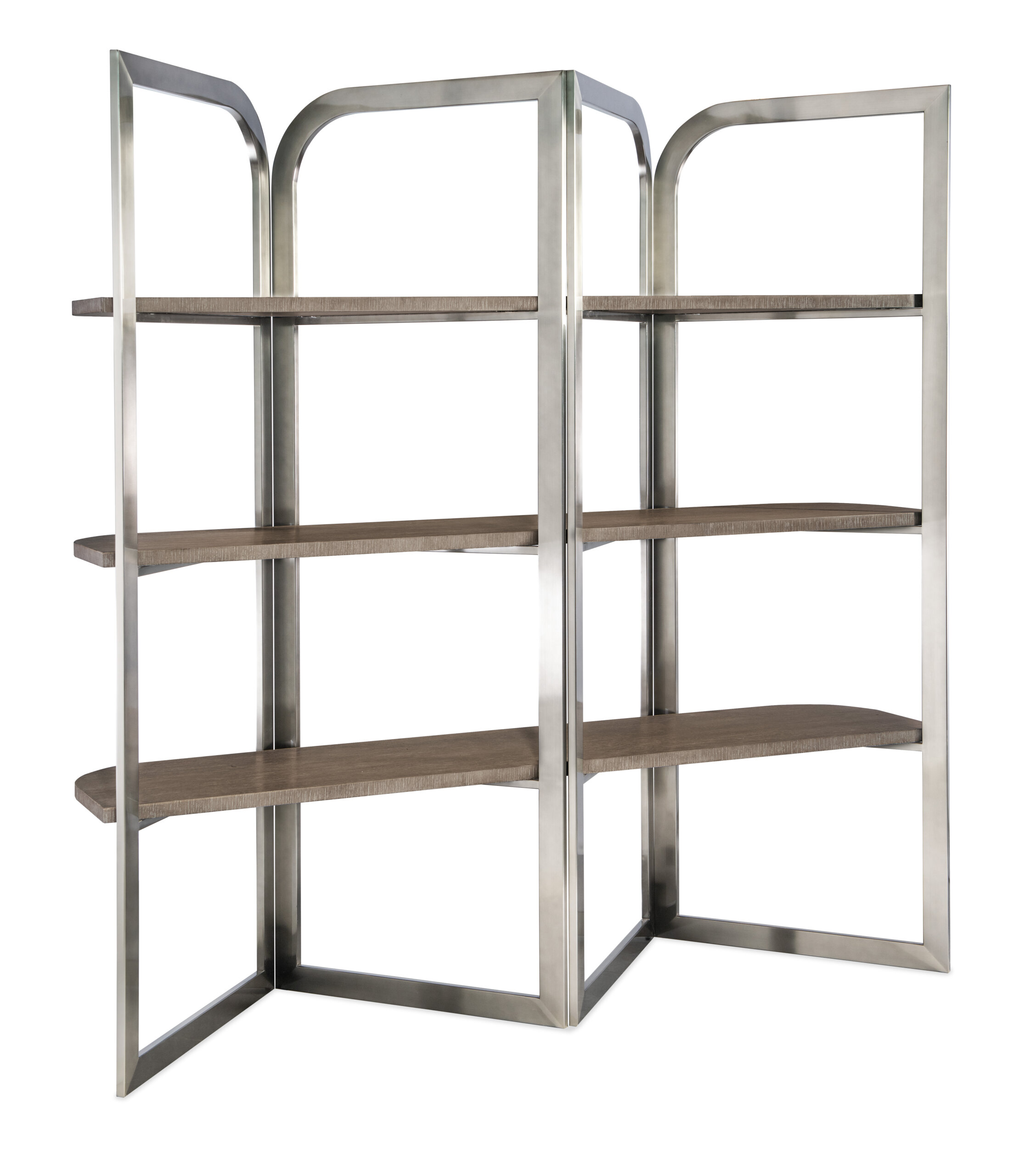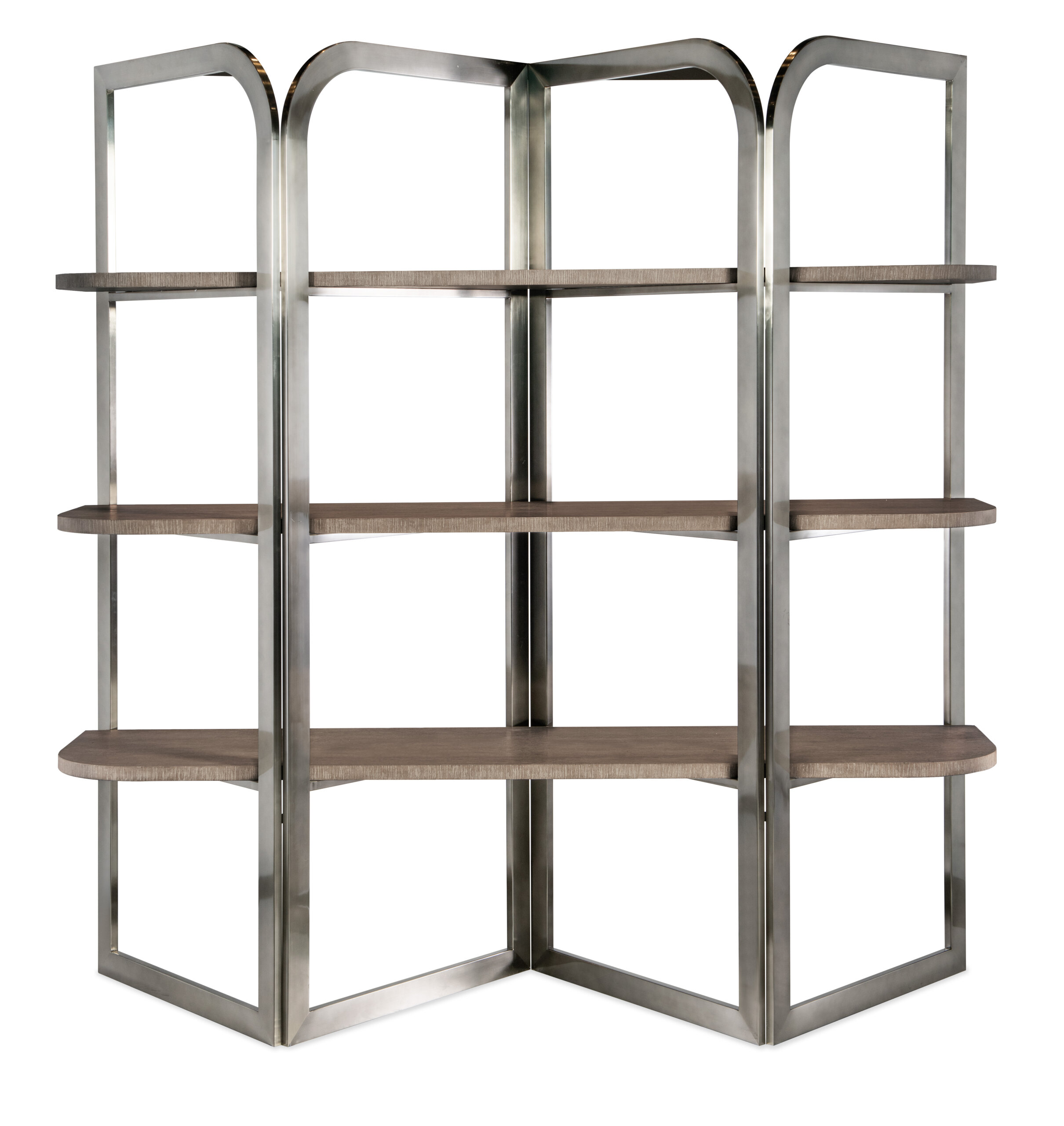 Architectural and artistic with a luxe mixture of materials, the Modern Mood Etagere has three fixed shelves crafted of wire-brushed Quartered Oak in the Mink finish with dark, earthy brown hues with notes of black. The shelves are surrounded by a shaped brushed metal frame in a warm pewter-colored finish. Finished all the way around, the shelf can be used from either side and can float in a room.