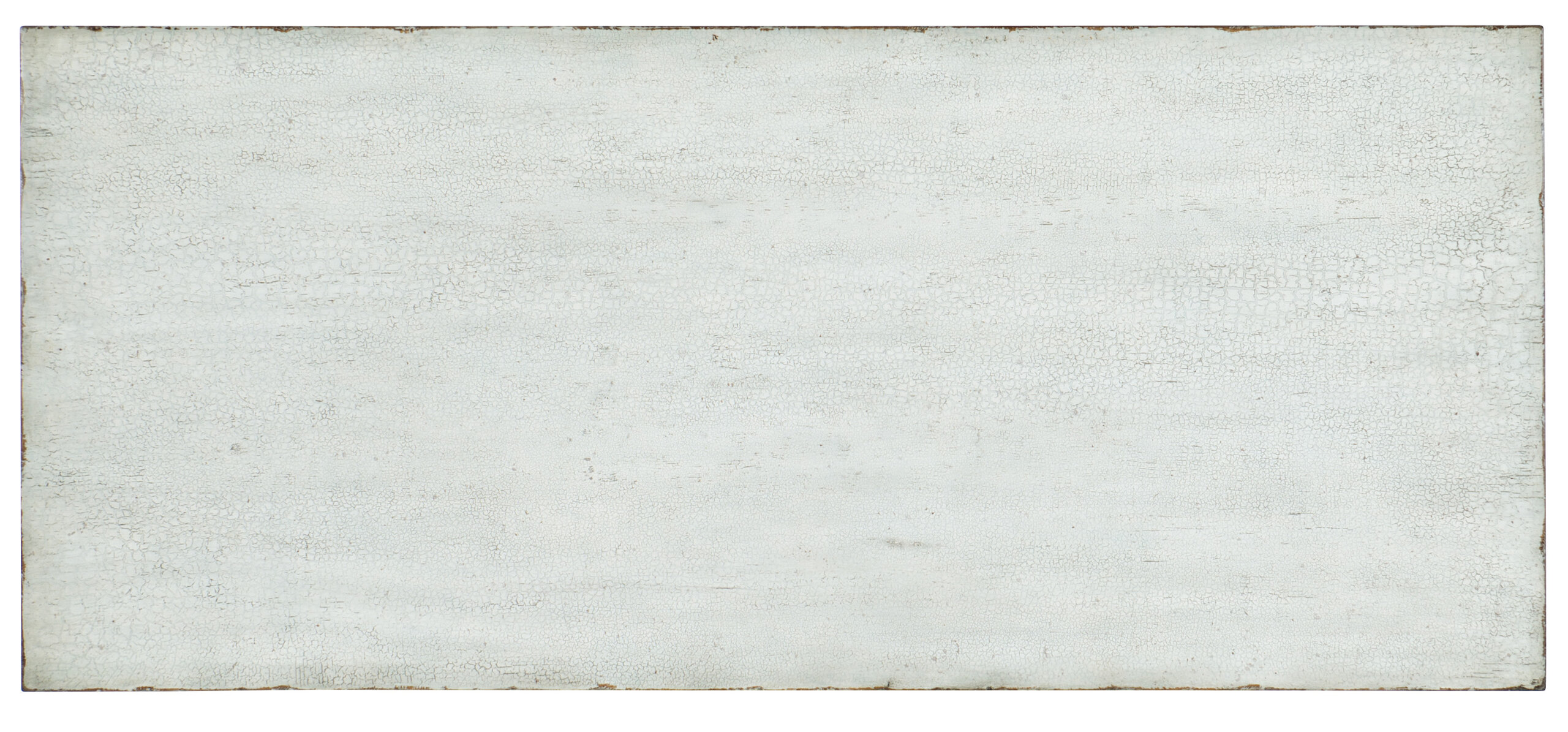 Limestone (crackled white) finish. Distressing includes hand planing, wormholes, rock, rasping edge and scraping. Hand hammered florentine gold colored hardware.