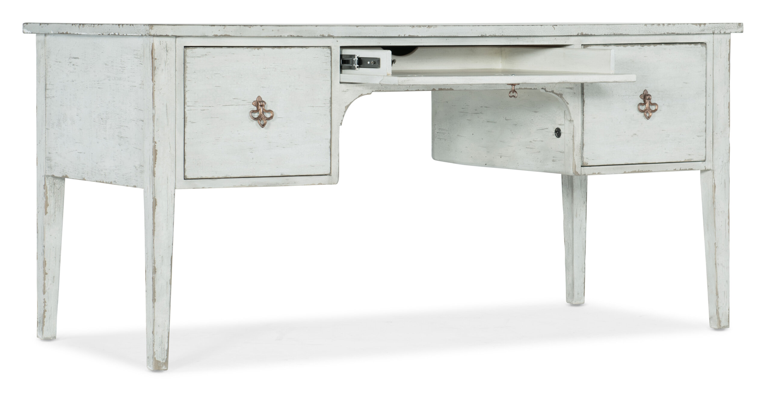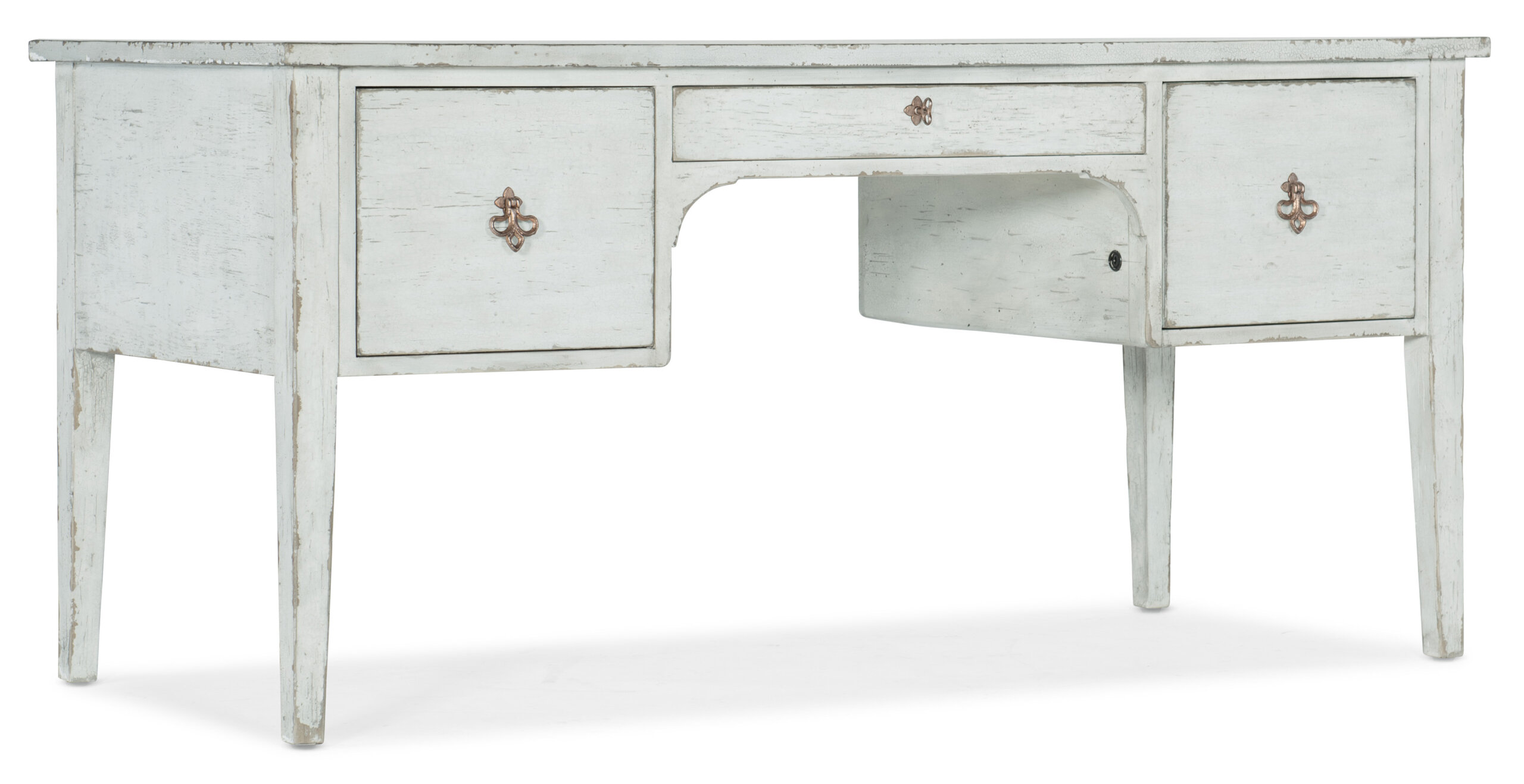 Be transported to the Italian coastline of the Adriatic Sea as you work at the aspirational Arturo writing desk with its authentic European provincial styling and charming cracked white Limestone finish. Fleur-de-lis-shaped Florentine gold-colored and hand-hammered hardware add design flair. One keyboard drawer with drop front, and one locking drawer on each side. Crafted of Oak Veneers with a solid-wood edge top.