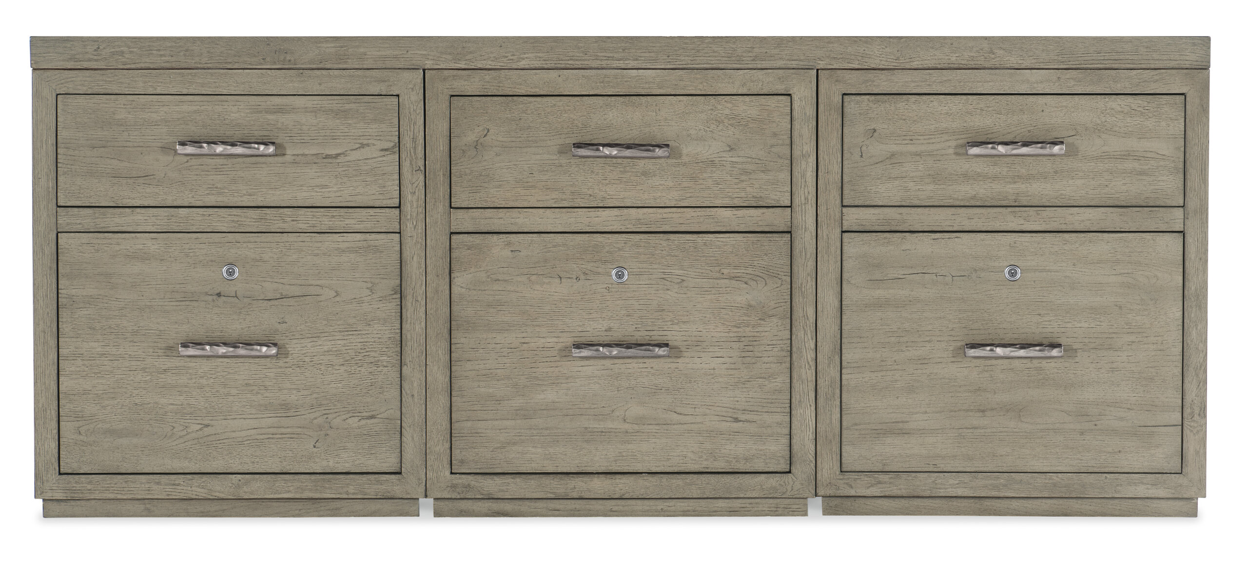 With a rustic weathered finish and clean modern lines, the Linville Falls Credenza includes a 72-inch top and three small files packed with function. Offering a total of 6 drawers, the top drawers are utility drawers and the bottom drawers are locking file drawers with pendaflex filing systems. Crafted of Oak Veneers, the credenza is finished in Mink, a soft smoked gray, and accented with textured metal bar pulls in an antique pewter finish.