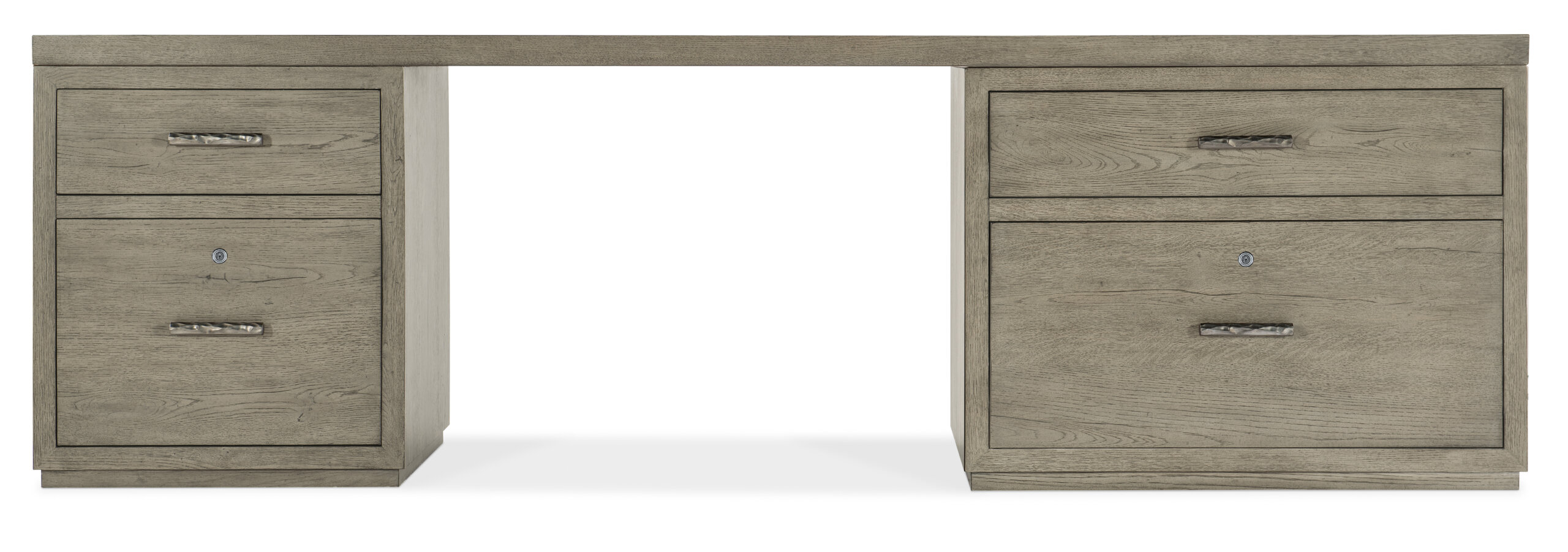 With a rustic weathered smoked gray Mink finish and clean modern lines, the Linville Falls Desk includes an expansive 96-inch top, a small file on one side and a lateral file on the other. Altogether, there are 4 drawers, including 2 top utility drawers, and the lower drawers are locking file drawers with pendaflex filing systems. Fully finished on the back, the desk can be floated in a room.